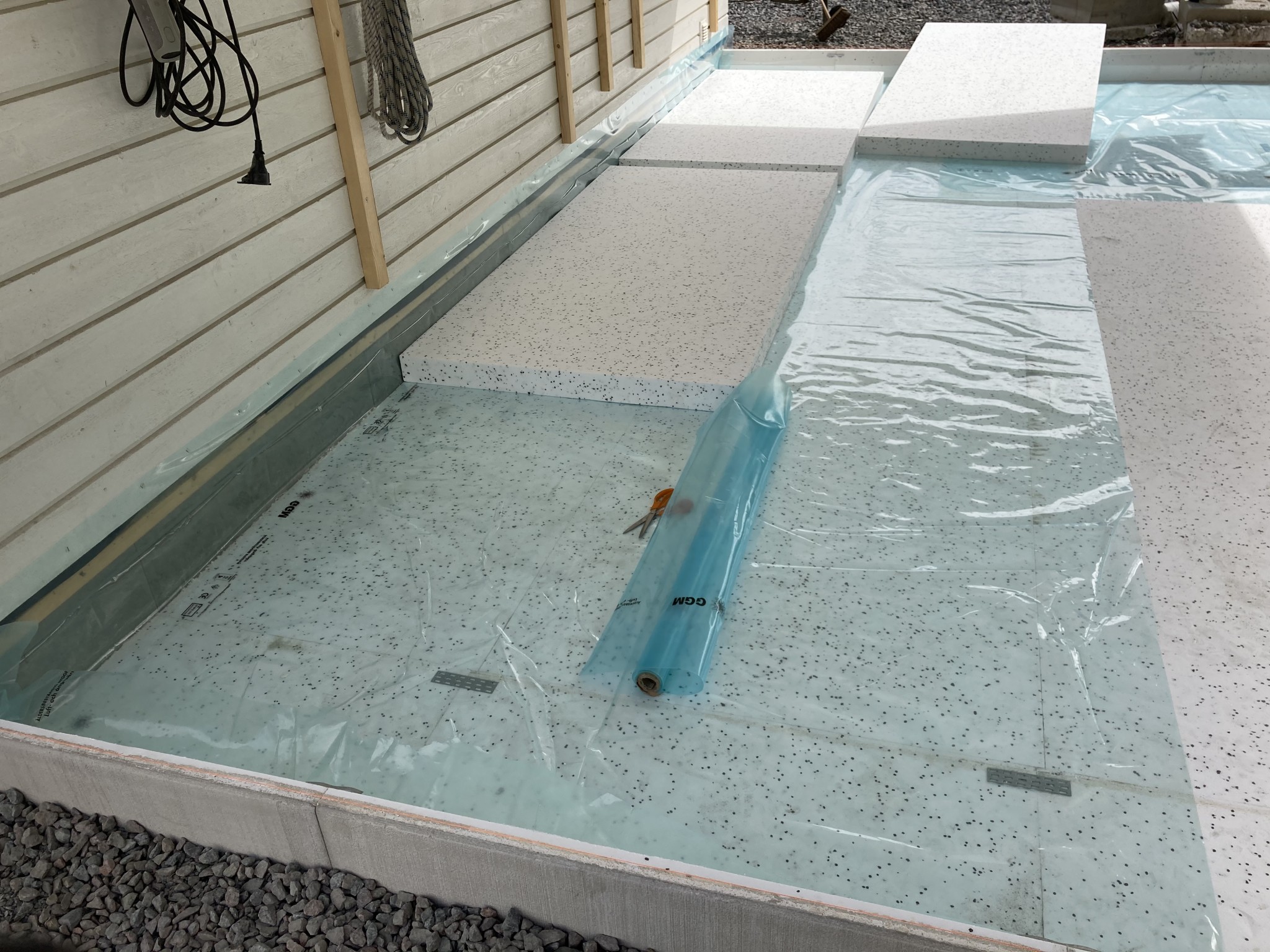 Den gamla och nya plattan skall inte vara förankrade med varandra. Risk för sprickor om jag förstått rätt. Lägger därför en byggplast mellan. Passade samtidigt på att lägg plast mellan cellplastskivorna som en extra fuktsäkring