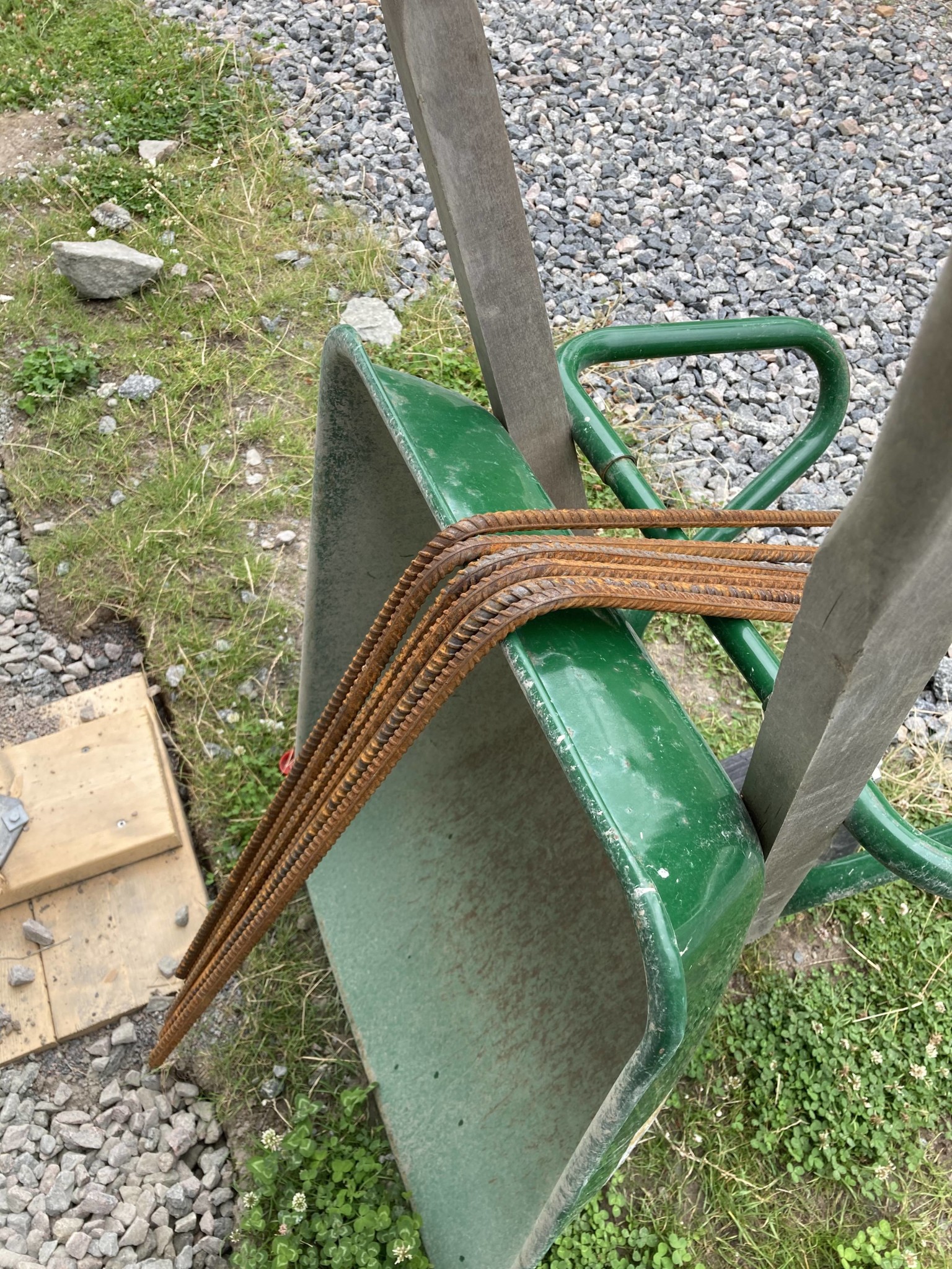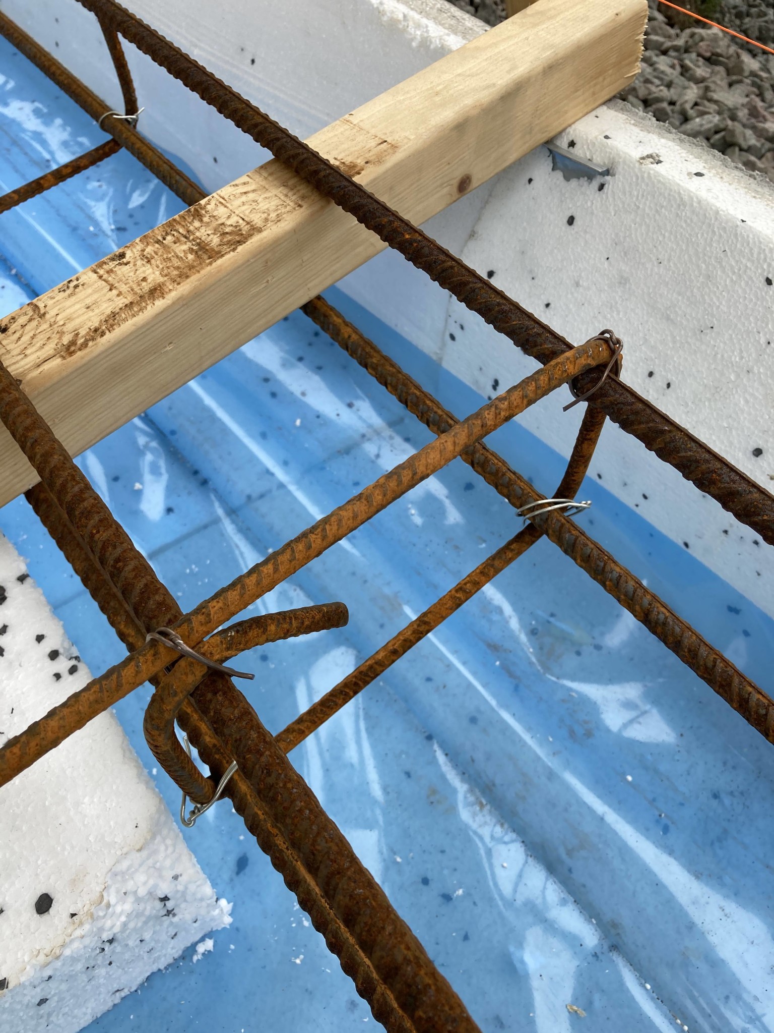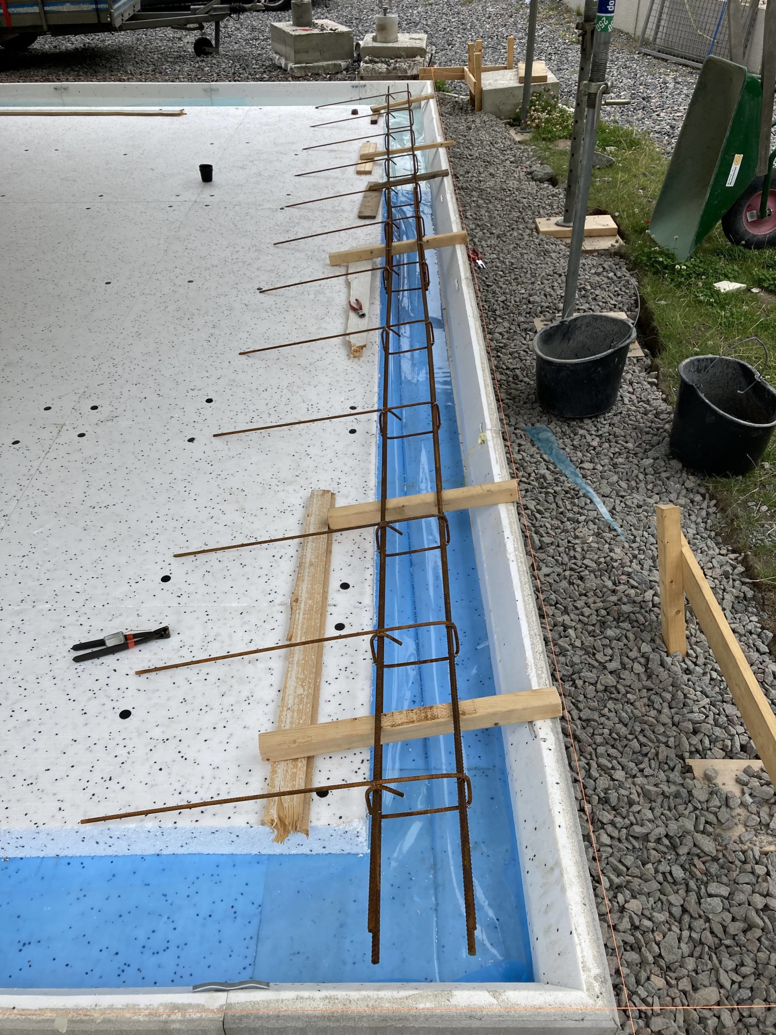 Jag har frångått konstruktionen som är i början av tråden som är dubbelarmerad. P.g.a. BK3 skulle det bli väldigt många lass med betongbil..$$ Kör istället på "vanlig" kantbalk 2+2 12mm järn med 8mm villabygel på cc60, förutom vid porten där det blir cc40 efter tips från Mikael_L