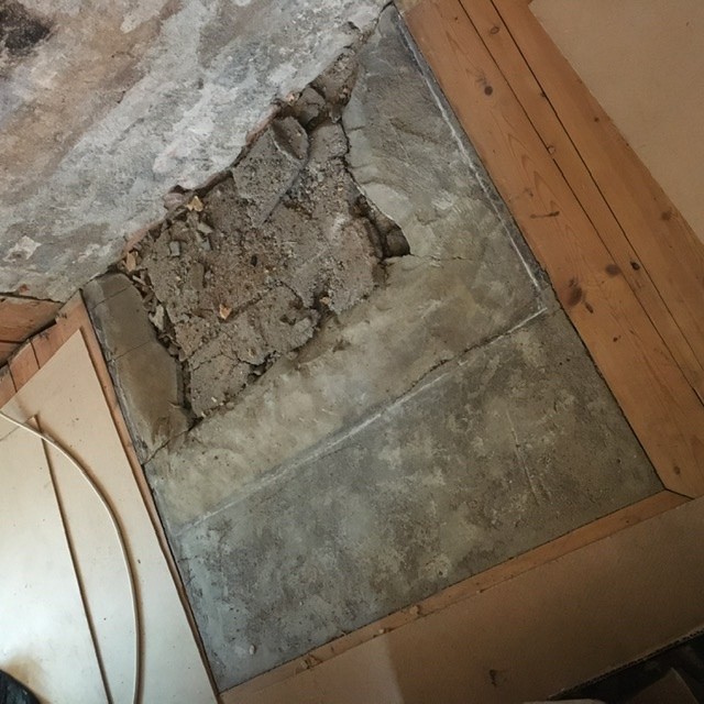 Jag ska gjuta en platta till den nya braskaminen på en befintlig platta eftersom det saknas material där den gamla spisen stod.