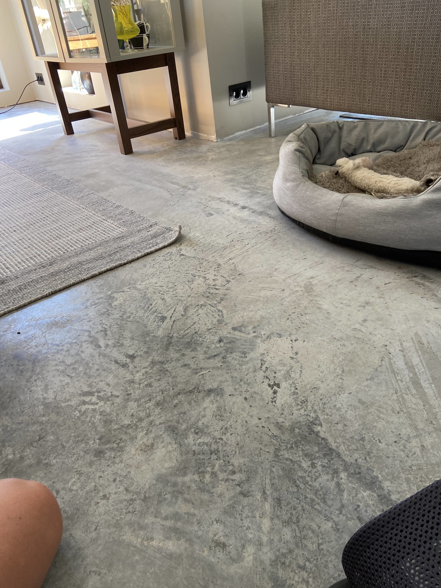 Min sambo och jag är överens om att vi vill ha en oborstad råå look på golvet på entréplan. Matt betonggolv i en ljusgrå nyans.