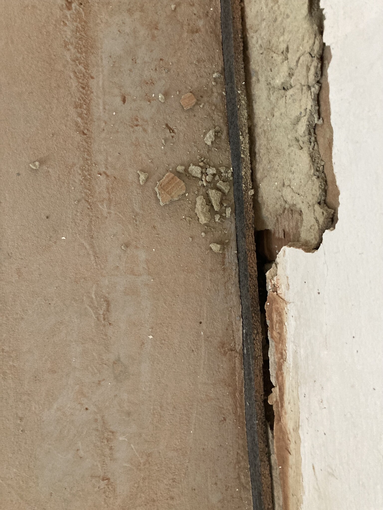 Vi har nu upptäckt att det finns större och mindre glipor neråt marken (det som finns under plattan) mellan plastremsan och ytterväggarna nästan överallt. Vi hade inbillat oss att plastremsan hade suttit direkt mot väggen för att hindra att fukt och/eller kyla tränger upp och på sikt skadar det nylagda furugolvet.