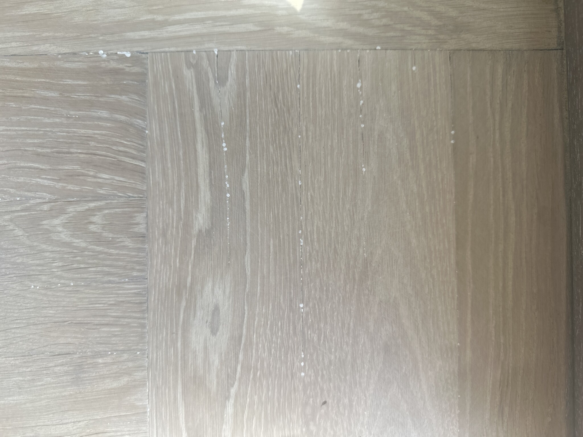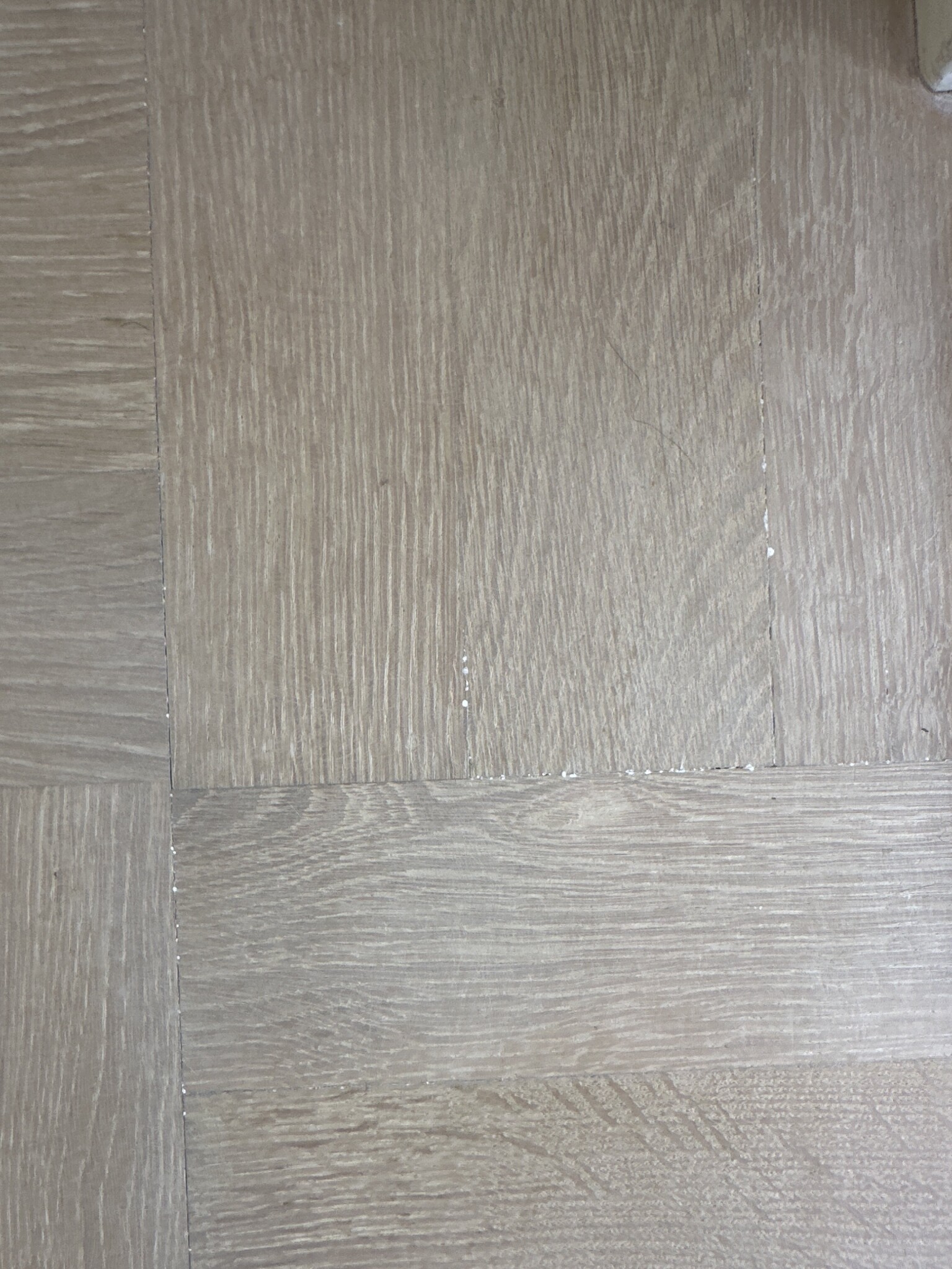 Det finns nu vita ”kristaller” på en hel del ställen på dessa två golv, liksom vita prickar i springorna. De syns tydligt. Hantverkarnas arbetsledare säger att ”det kan bli så”.