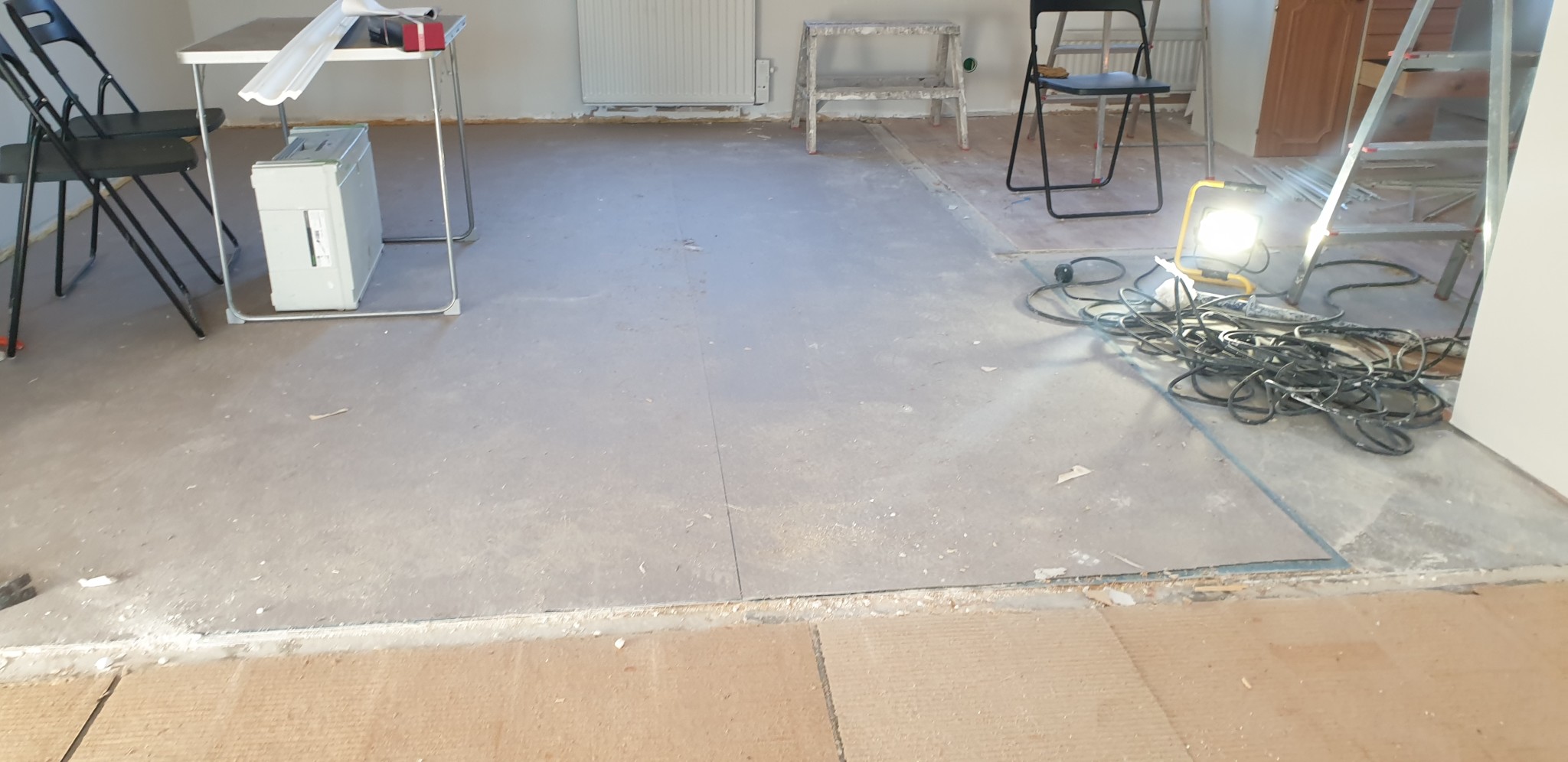 Nån som har tips på hur man kan jämna av golvet utan att behöva riva upp en gammal matta i 2 av rummen 3dje rummet är det ingen matta. Betongplatta på mark? Ska lägga parkett, helst i morgon