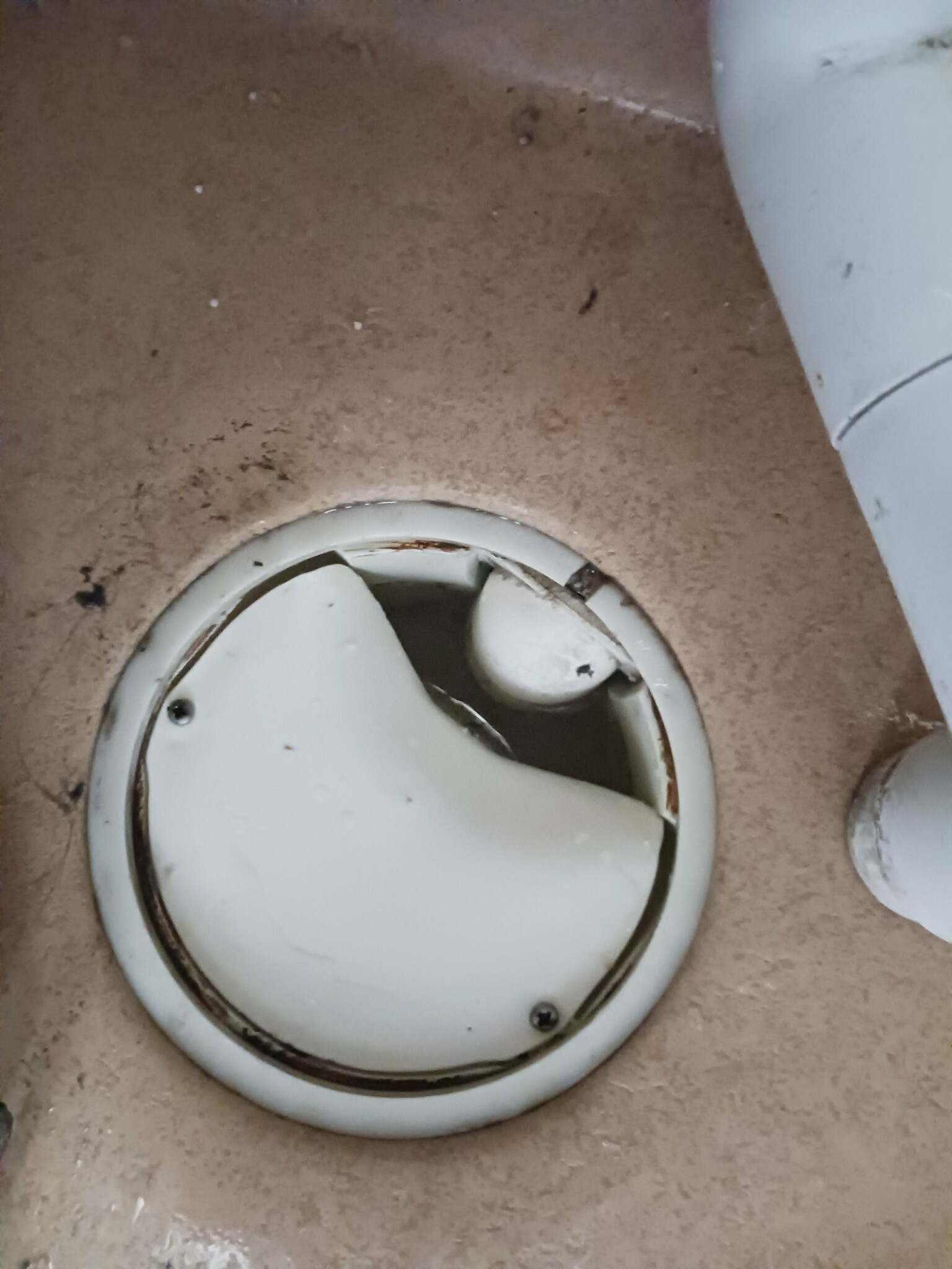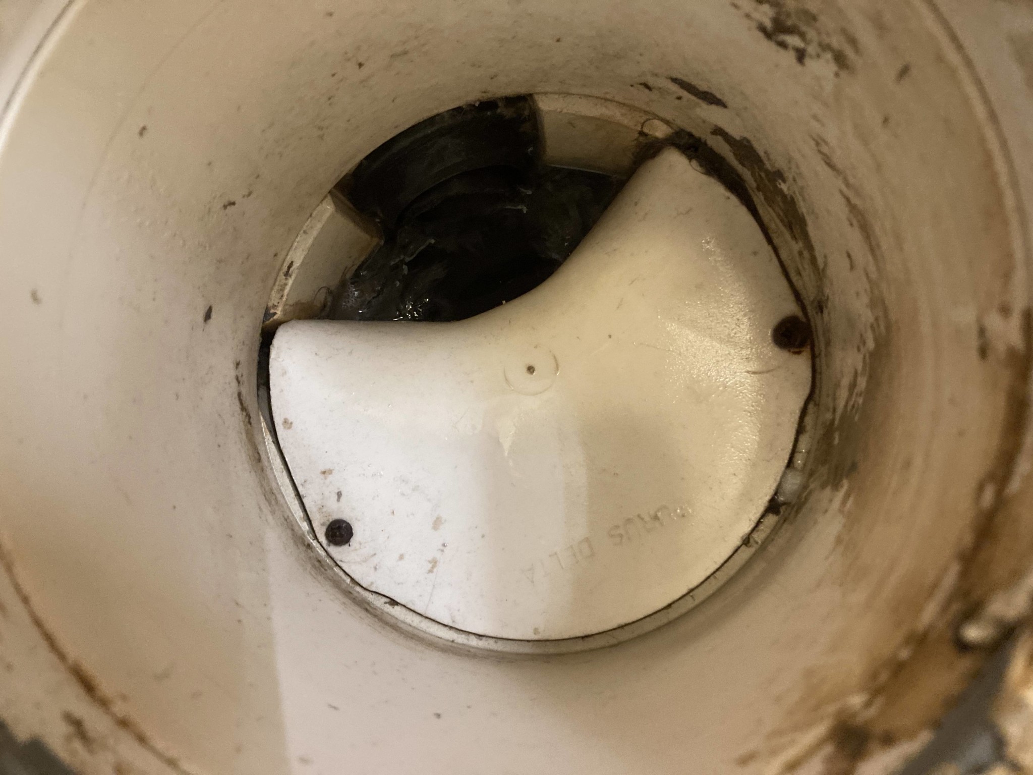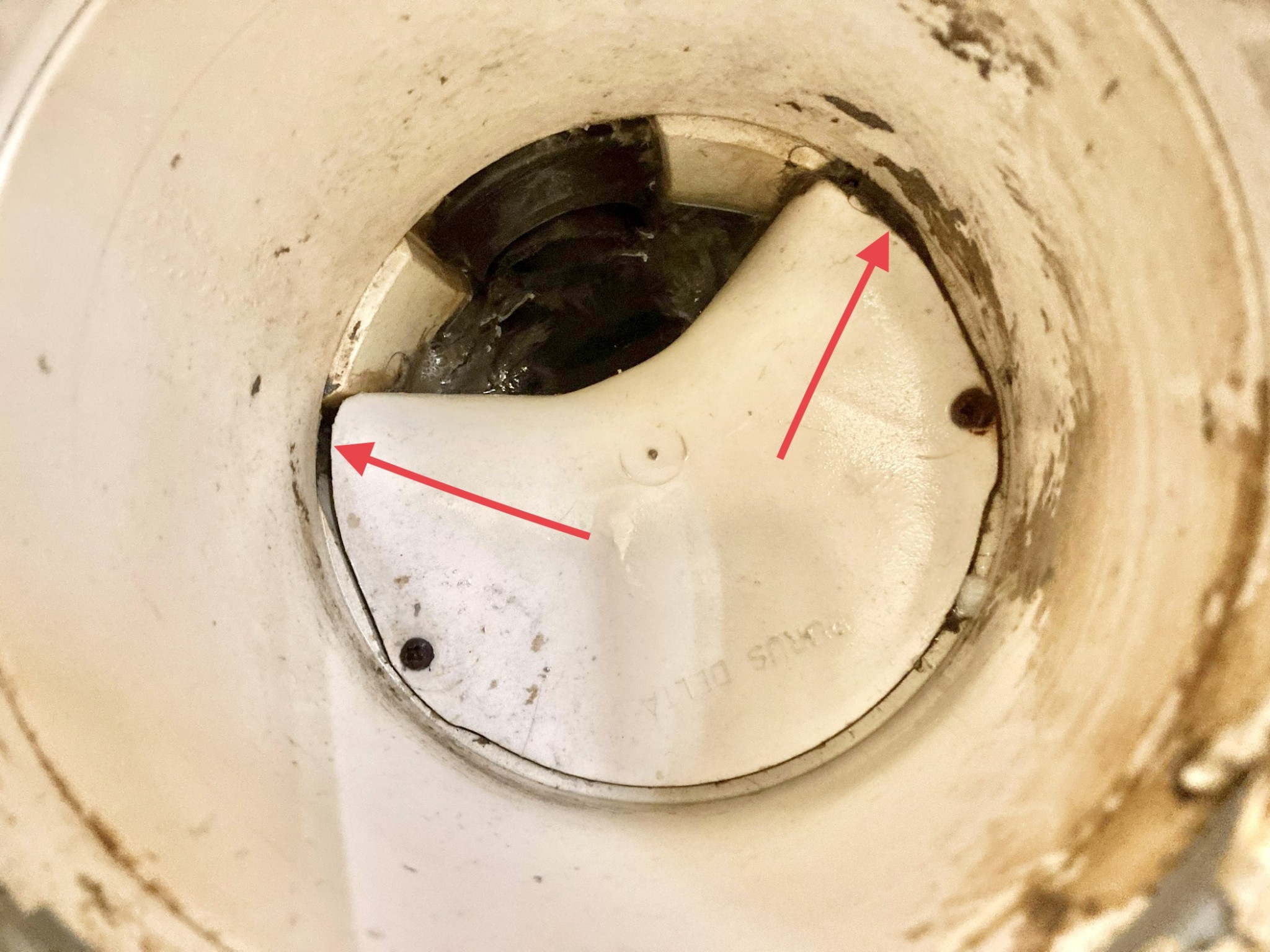Tittade lite noggrannare på bilden och jag tycker det ser ut som att insatsen kapats i kanterna just där den upptill är/varit som bredast, markerat med röda pilar på bilden. Det ser ut som att insatsen intakt skulle bli bredare än hålet ovanför, så det kan vara en förklaring till att det gjorts. Dessa blir ju öppningar där avloppsluften kan passera trots vattenlåset. Att det luktat mer efter rengöring kan bero på att hår och annat som täppt till dessa hål då städats bort.