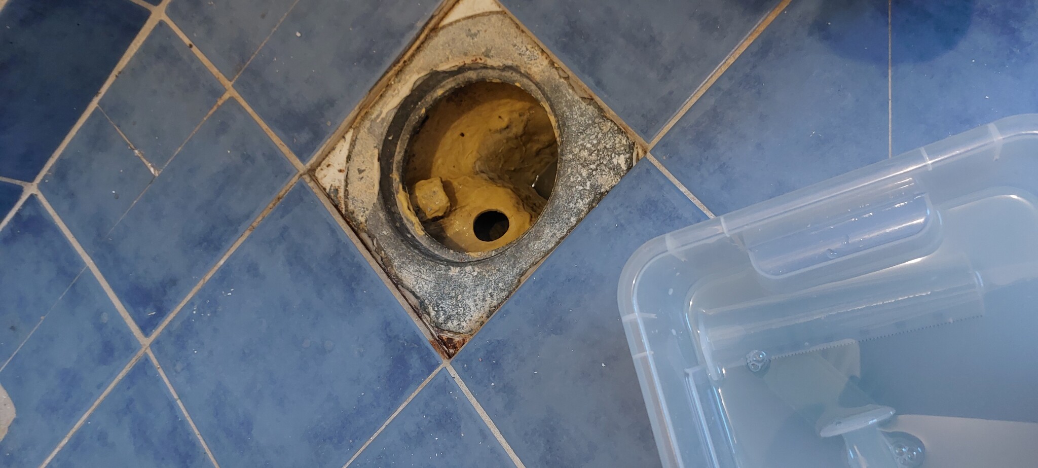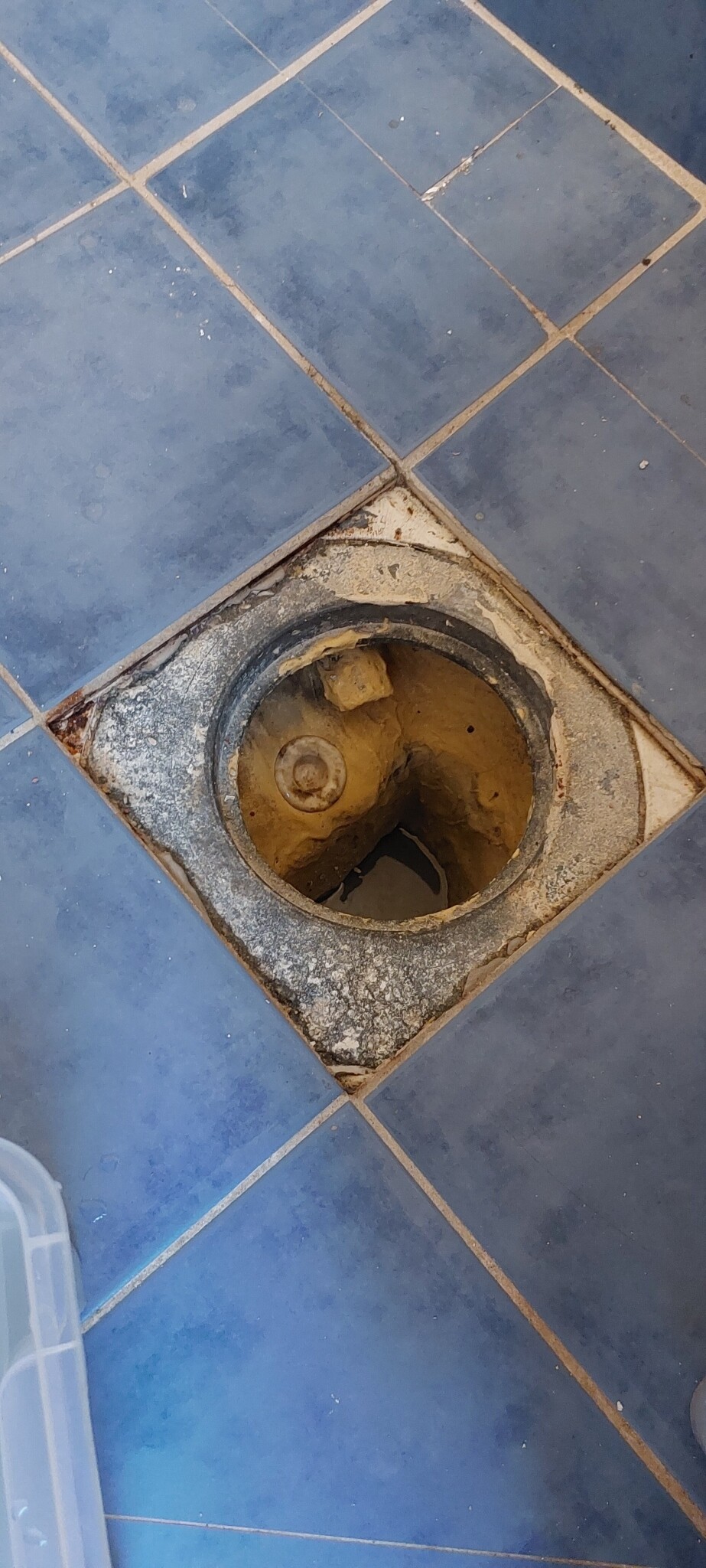 Nu satt ju ramen till golvbrunnen lite snett så den börjar man såklart pilla på.. märker då att hela täckramen sitter lös. Fuktigt i fogen runtom och knackar jag på plattorna runtom låter det mer ihåligt än plattor längre ifrån brunnen. Inte så jag kan rucka på dom dock.