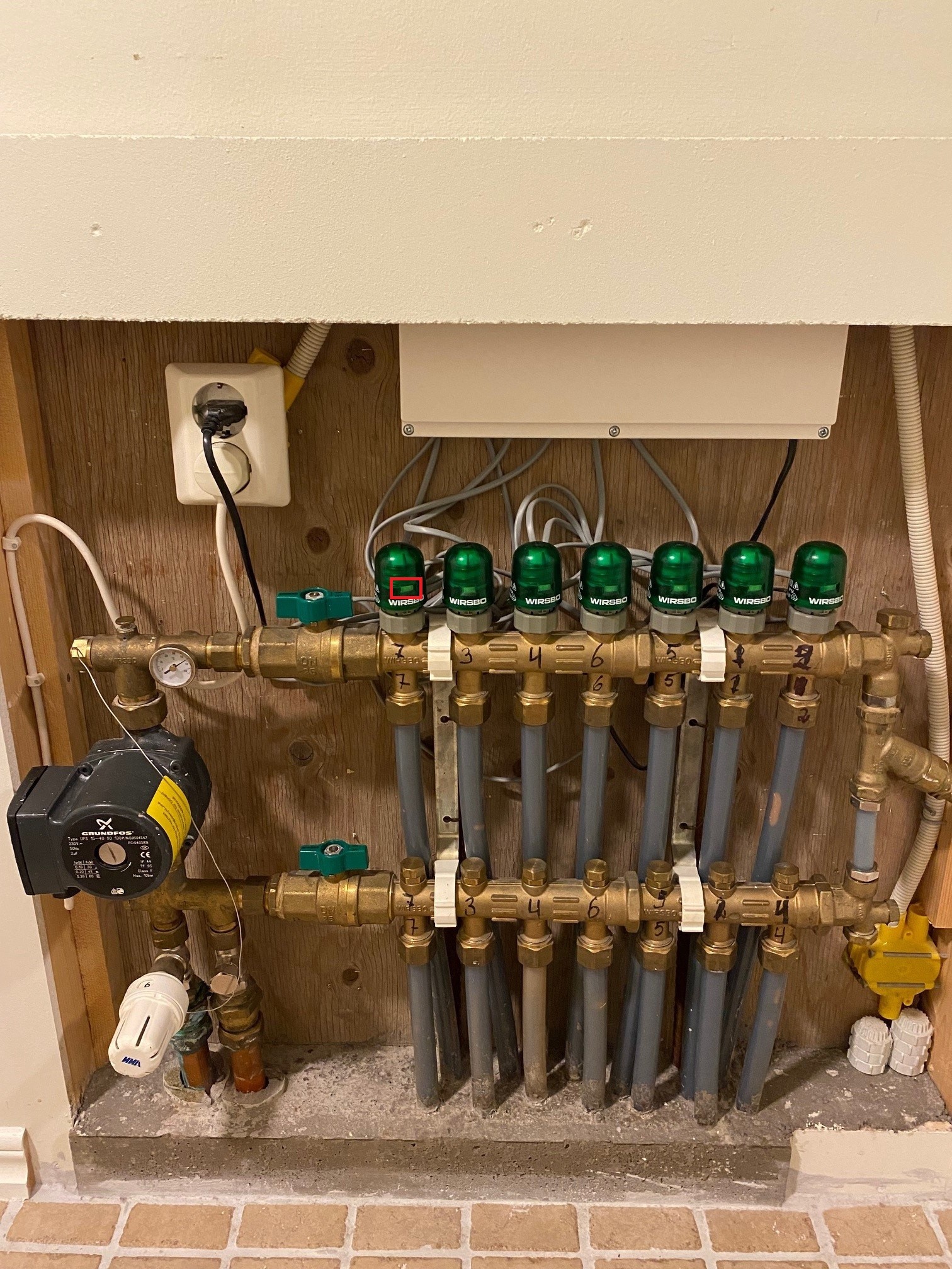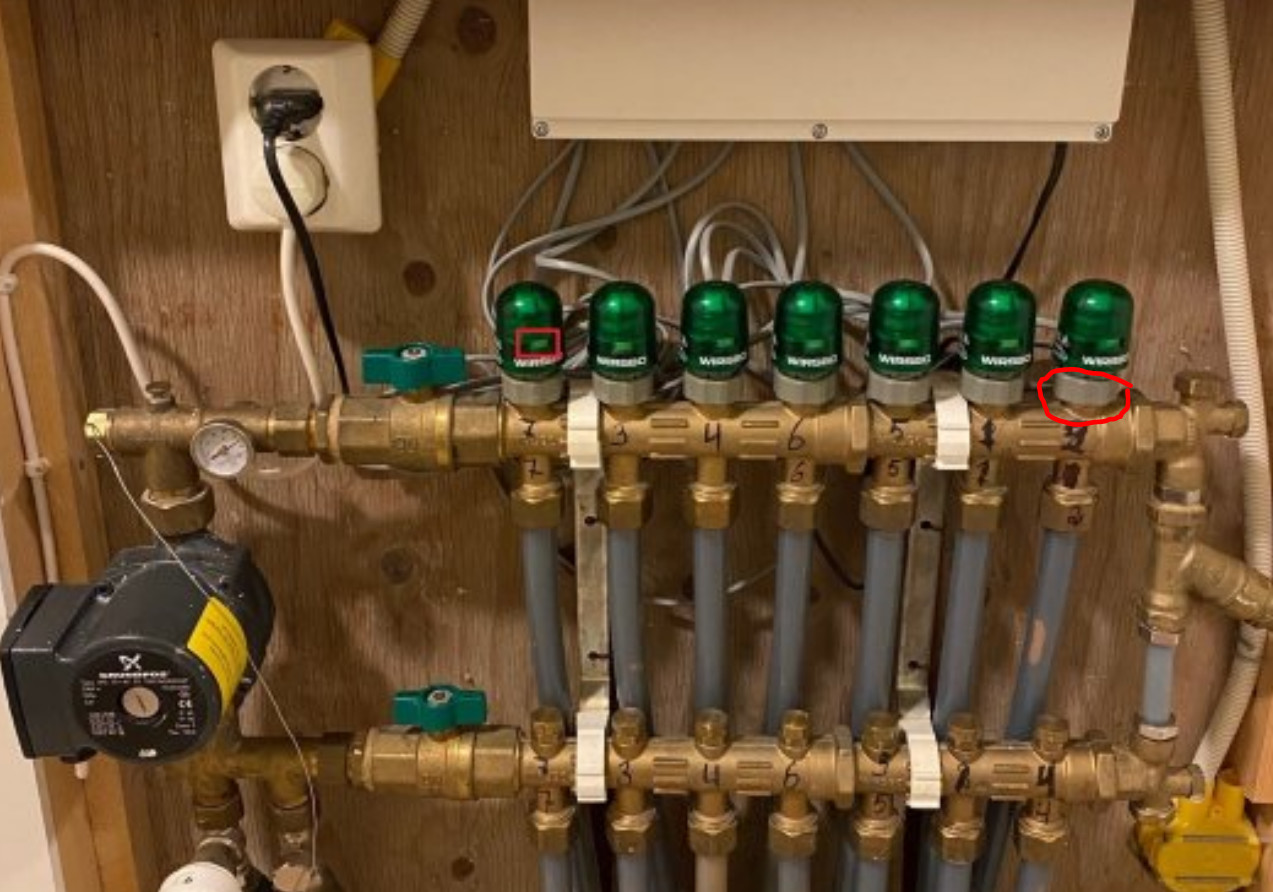 Fullt blås på samtliga termostater, som jag inte tror fungerar eftersom när jag vrider ner dem till min, så stängs inte slingan (markerat inom den röda fyrkanten på bilden, för visst ska den inte vara vit om den är på och inte om den är av?)