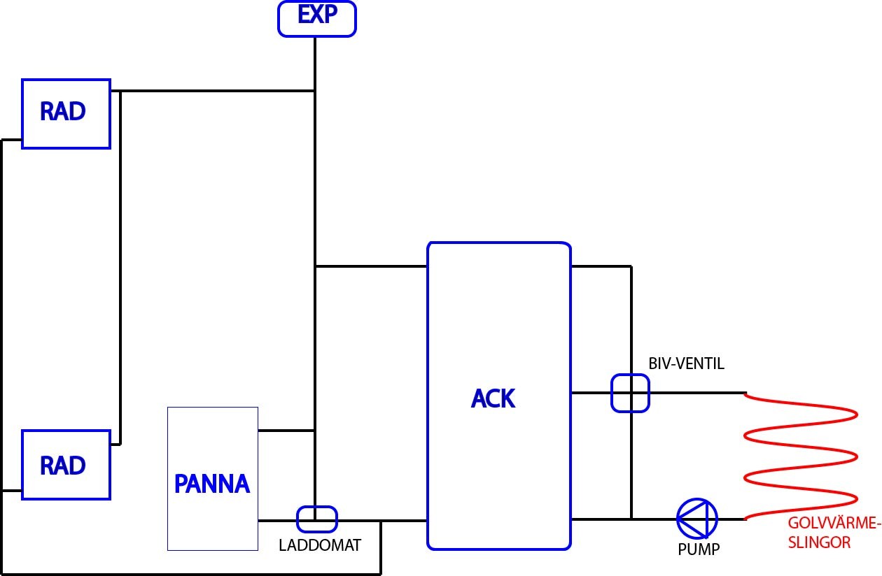 Hej! Chansar på att ta upp tråden igen, då jag har tankar på ett exakt likadant system... Såklart intressant hur det fungerar? Hur funkar reglering av värme ut på radiatorerna? Ingen shunt? Jag tänkte att man borde kunna sätta en shunt, men är lite orolig att det inte finns något öppet rör rakt upp mot expansionen då?B Bergsunda skrev:Jag funderade också på om det går att ha en laddkrets utan pump men är osäker på om det funkar. Min lösning som finns i skissen ovan är lite av en kompromiss. Jag tänker att när allt är frid och fröjd laddar laddomaten och dess automatik pannan med lagom varmt vatten och jag får ett effektivt och skonsamt utnyttjande av pannan. Om/när strömmen går räcker ändå rördimensionerna till (1") för att det ska bli ett tillräckligt flöde genom ackumulatortanken och jag kan fortsätta värma huset även om jag får elda lite försiktigt.