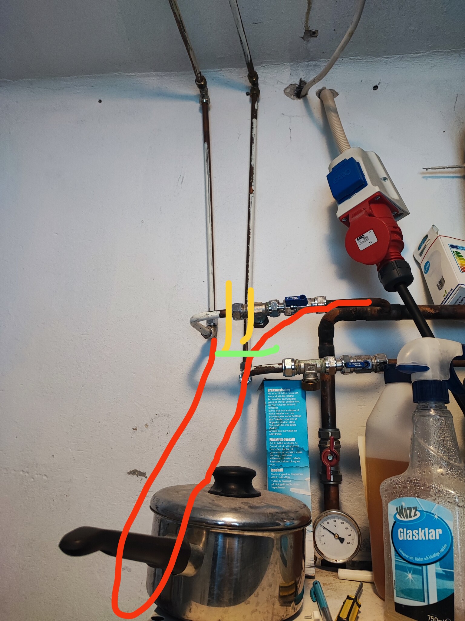 Tunna rören till vänster går upp till endast en radiator och tillbaka, tänkte om man kan ta gv på returen och sen till riktiga returen.