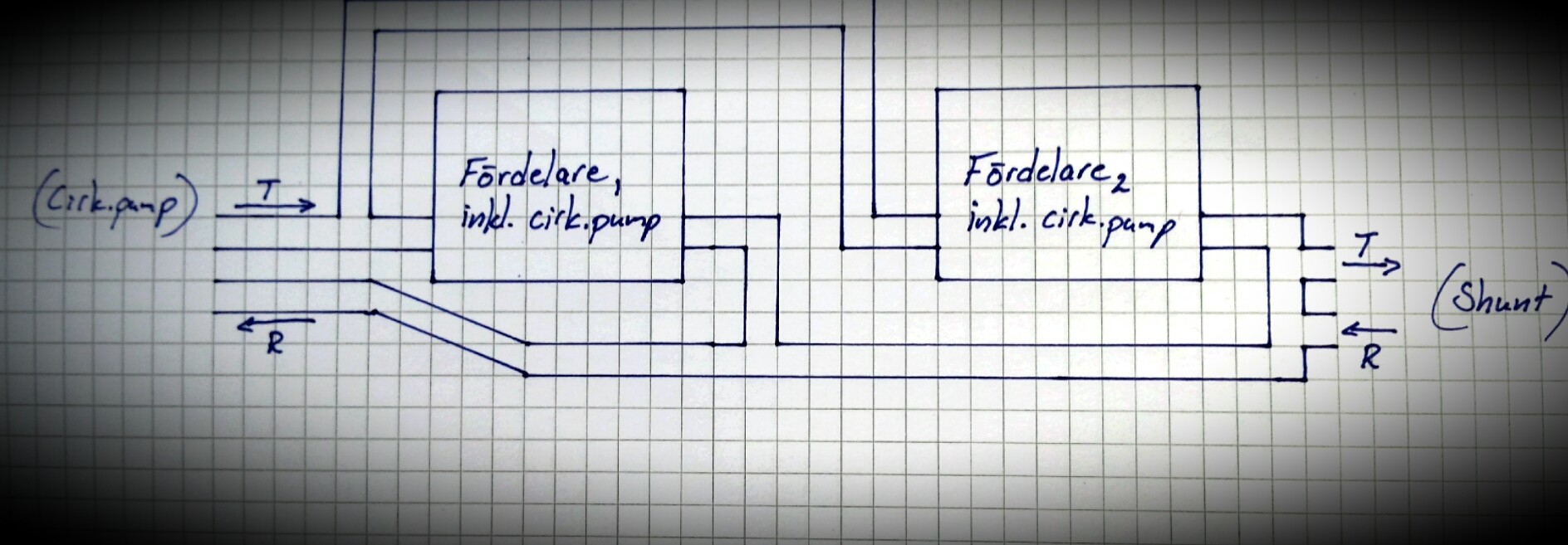 Ska till att löda ihop cu-rören till fördelarna för golvvärme och till shunten för radiatorslingan i källaren. Känner mig dock osäker på om jag kan dra rören enligt skissen där jag planerat nyttja returvattnet och cirkulera det i källarelementen. Kommer ha flera grader lägre temp i källaren som ej är boninginredd. Enbart gym och spartansk tvättstuga.