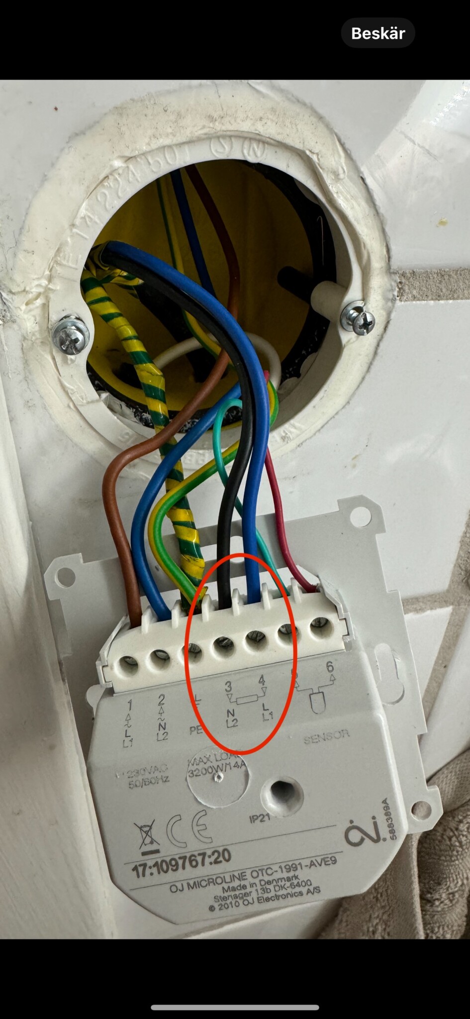 När jag tittade hur de äldre termostaten är kopplade så märkte jag genast att Devireg saknar koppling för skyddsjord. Men den gamla termostaten har däremot skyddsjord. Se första bilden nedan.