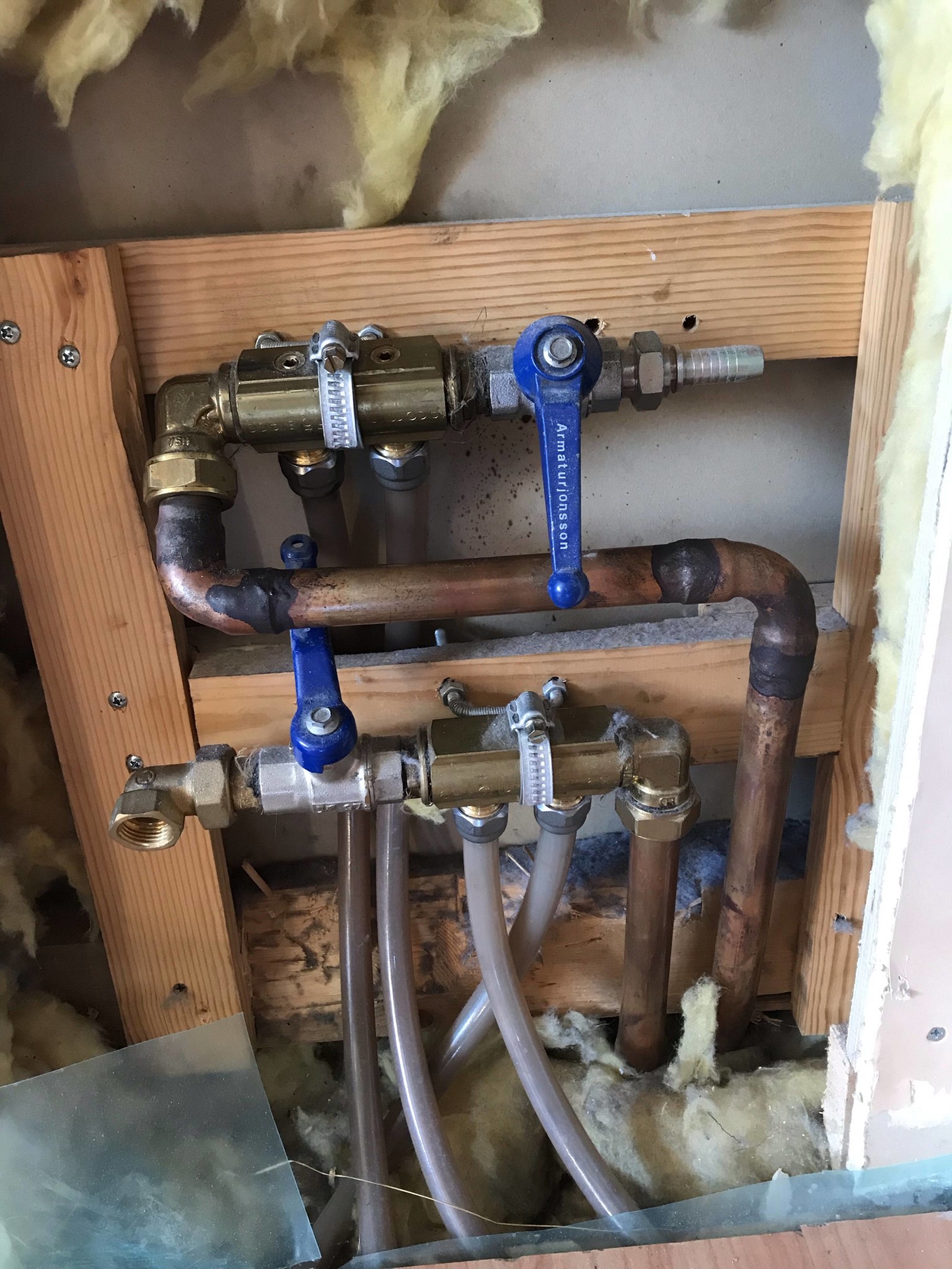 (3) På fördelare 1 sitter det på returen vad är avstängningsventiler för respektive slinga (under locken - eller vad de heter). De stod vatten i dessa nu när jag höll på att jobba med golvvärmen. De är inte avsedda att vara täta utan det är locken som har den funktionen?