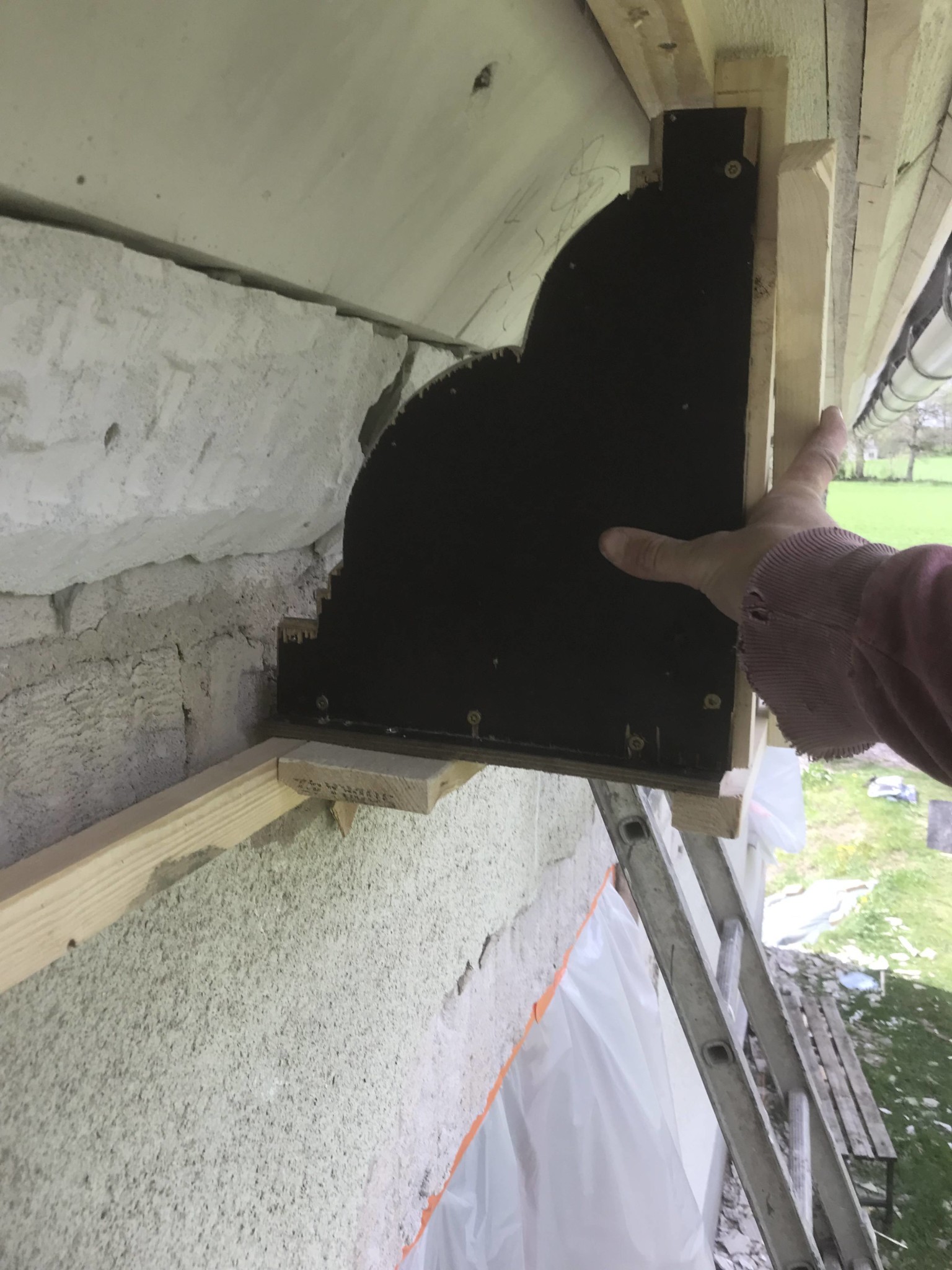 Som man ser på bilden har jag byggt ut gesimsen med lättbetong 15*20*60 cm grovt tillyxad. Denna är fäst i fasaden med dubbellimmad tunnfogsbruk (skitstarkt) och sedan har jag slagit in armeringsjärn genom stenen och in i stommen som lite säkerhet.