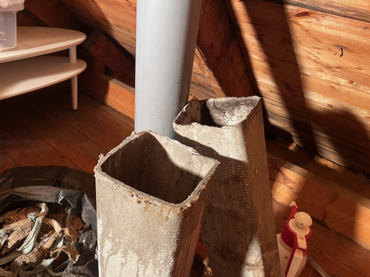 På bilden så är det avloppsventiliationen till vänster (bytte översta delen från järn till plast förra året) och till höger ventilationen från duschen (som är placerad rakt under). Materialet på denna trumma är något eternitliknande (har ingen aning om vad det faktiskt är).