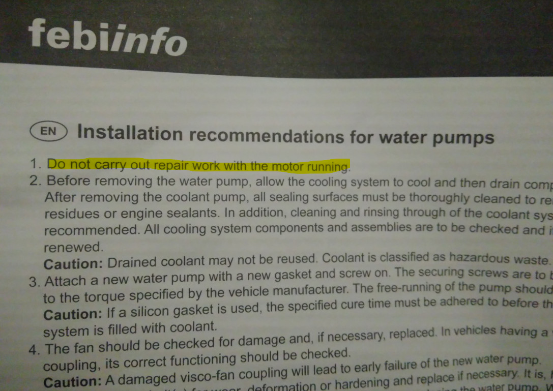Man har blivit klokare sedan 1980. När jag senast meckade med en gammaldags avgasbil för snart tio år sedan fick jag en lapp med vattenpumpen där följande står i instruktionerna som punkt 1. Jag vill inte veta varför den står där.P Pin skrev: