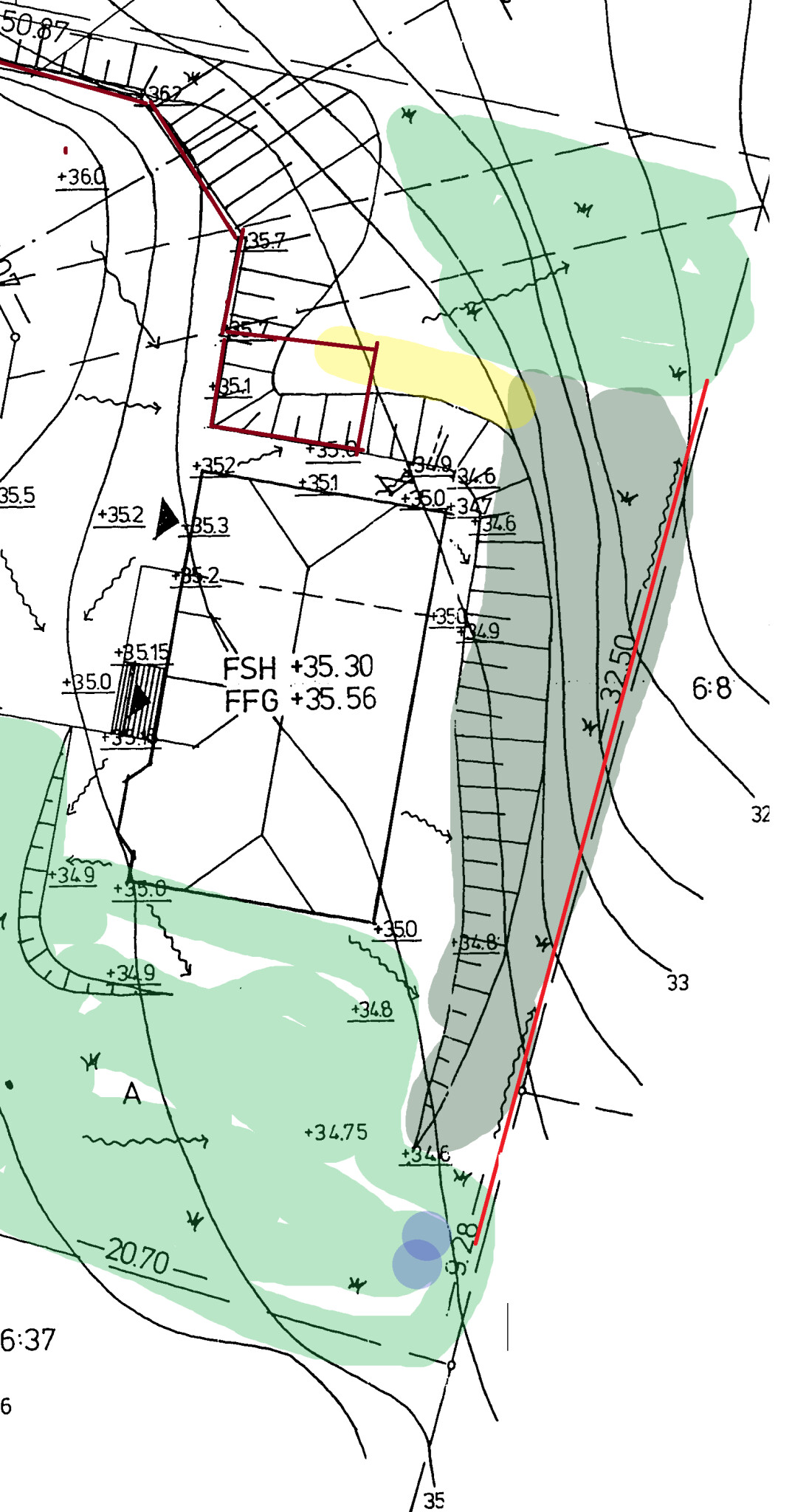 Bor på en tomt med en del höjdskillnader, tex har en plätt gräsmatta med äppelträd/kompost/vedförrvaring i norr, som ligger 4 meter under husets nivå, det är idag en brant backe (gula) med 45 graders lutning, därför mycket svårt att transpotera saker upp ner ved/jord/äppel/kompost. Så jag tänkte anlägga en liten stig i de röda fältet där man få en lång slutning