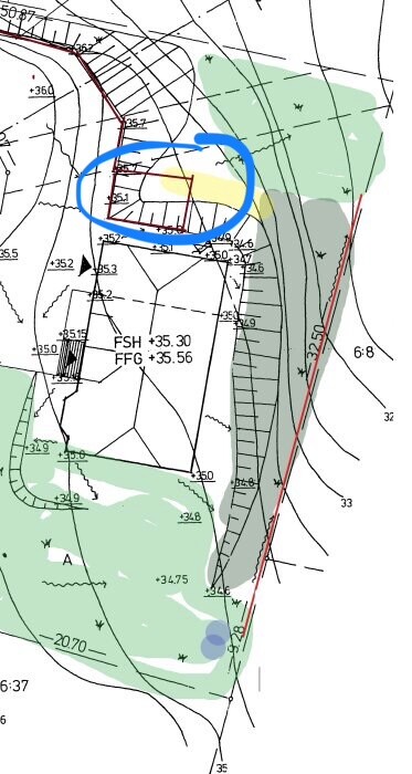 Bor på en tomt med en del höjdskillnader, tex har en plätt gräsmatta med äppelträd/kompost/vedförrvaring i norr, som ligger 4 meter under husets nivå, det är idag en brant backe (gula) med 45 graders lutning, därför mycket svårt att transpotera saker upp ner ved/jord/äppel/kompost. Så jag tänkte anlägga en liten stig i de röda fältet där man få en lång slutning