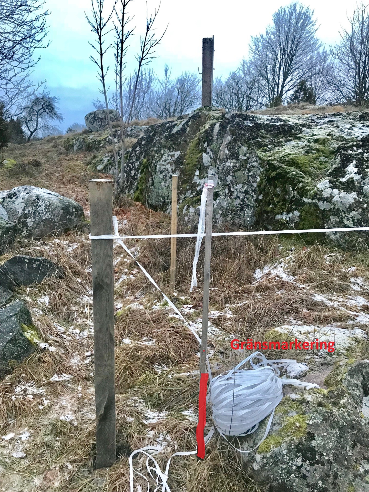 På bilden ser ni den rödmarkerade pinnen som sitter i gränsröret (vänster sida är min mark), gränsen går från den över berget och precis i vänstra kanten av betongstolparna.