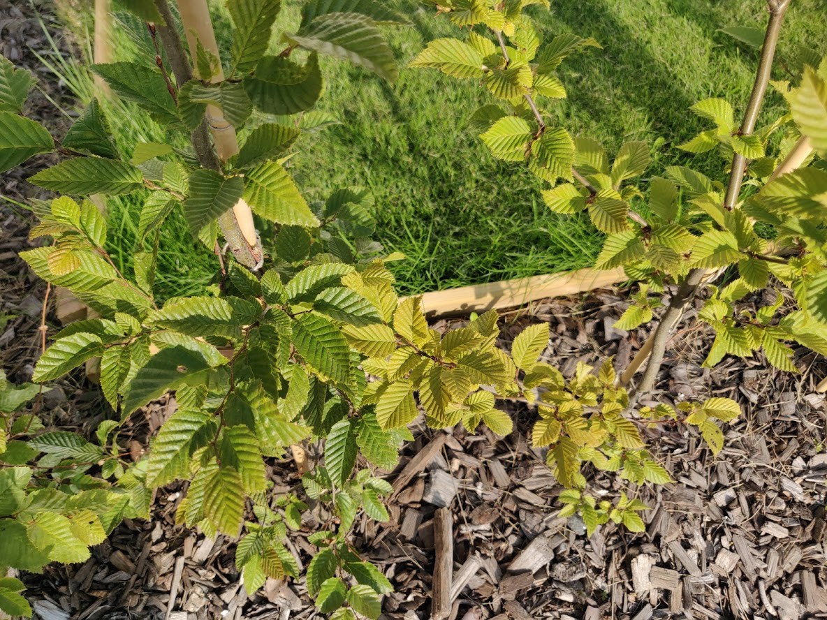 I våras planterade vi en avenbokshäck. Alla plantor har tagit sig, men vissa har fått en mer gröngul nyans på bladen än vad övriga plantor har (jämför plantan till höger med den till vänster i bilden). Är det bara naturlig variation, eller kan det tyda på att något är fel? De är planterade i samma jord och får vatten från samma bevattningsslang, så förutsatt att inte något är fel på slangen borde de ha ganska identiska miljöer.