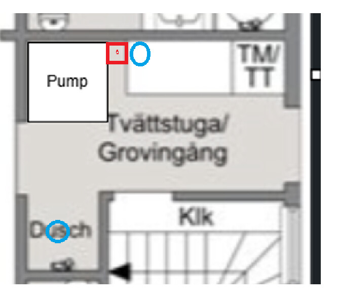 Jag planerar bergvärme och tanken är att placera nya värmepumpen där min VVB står idag. Det finns ett schakt/instick precis till höger om pumpen, den röda markeringen . Rummet har våtrumsmatta och våtrumstapet, troligen original från -71, så livslängden är sannolikt passerad sedan länge.