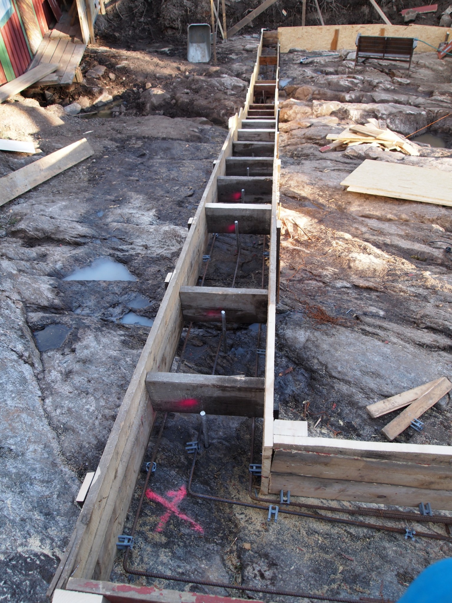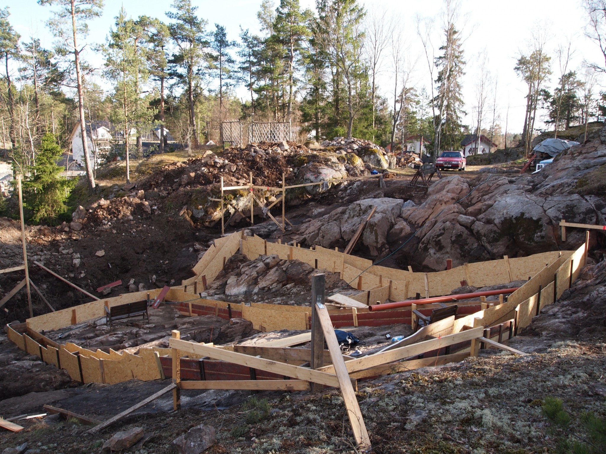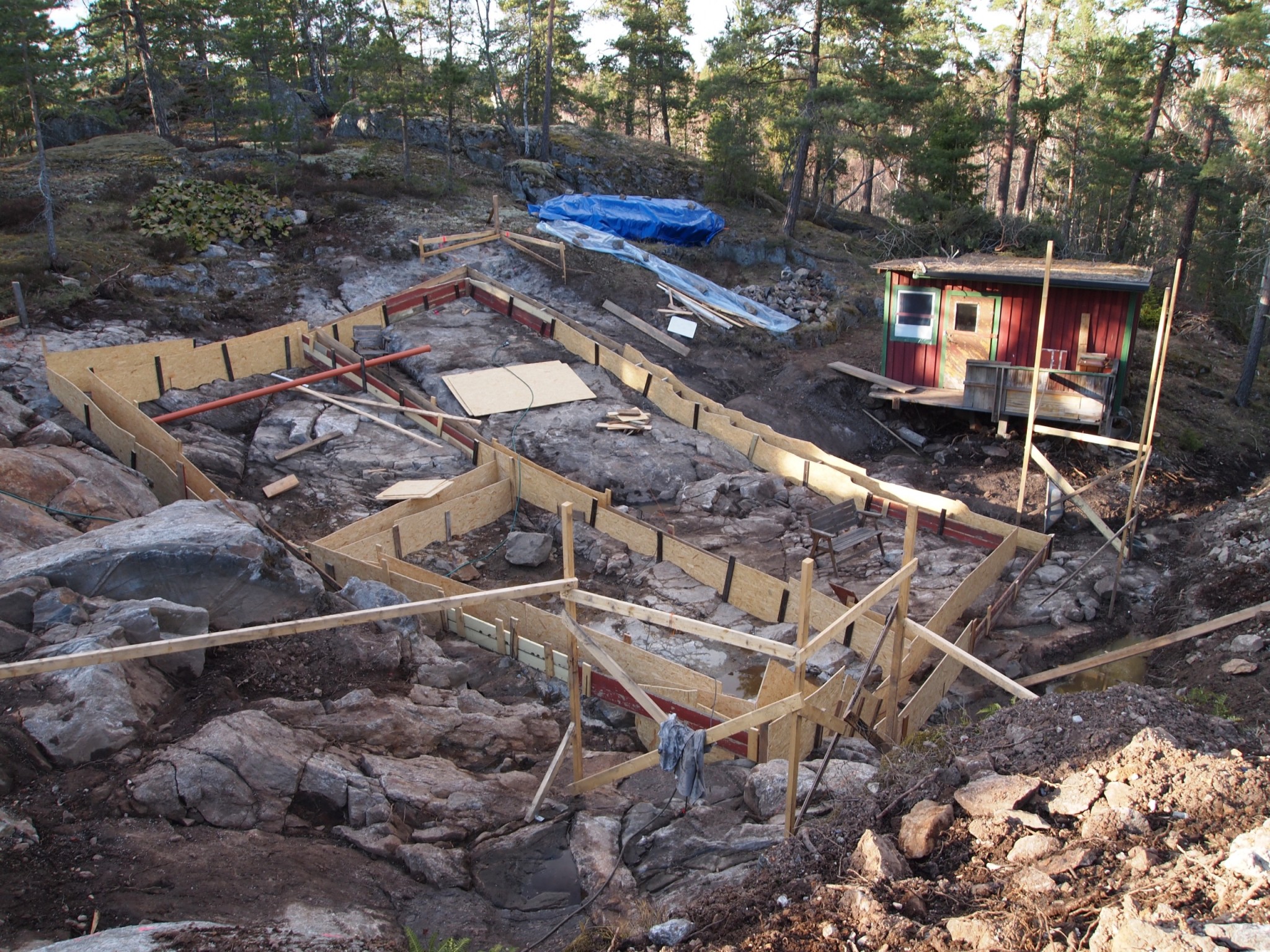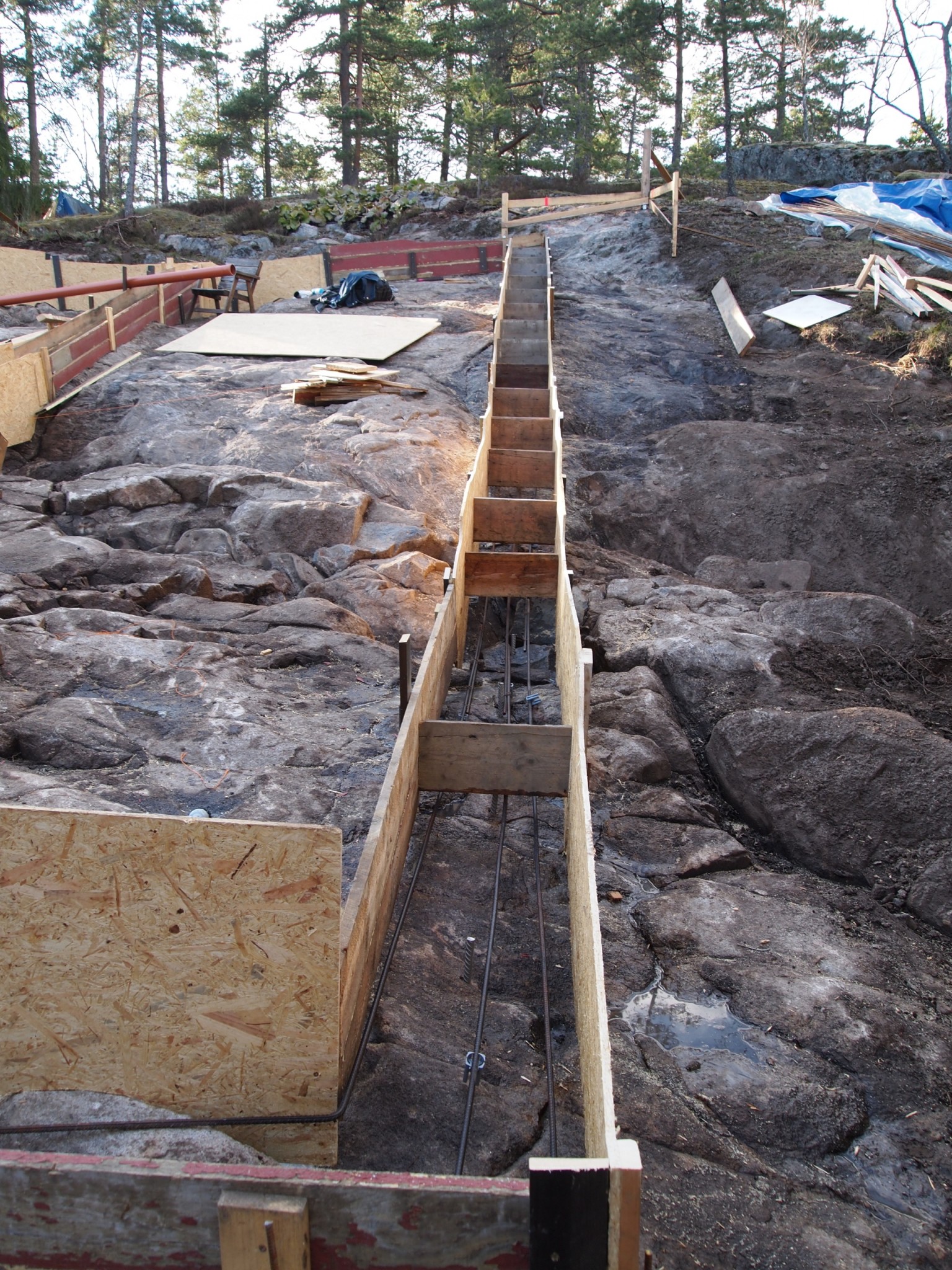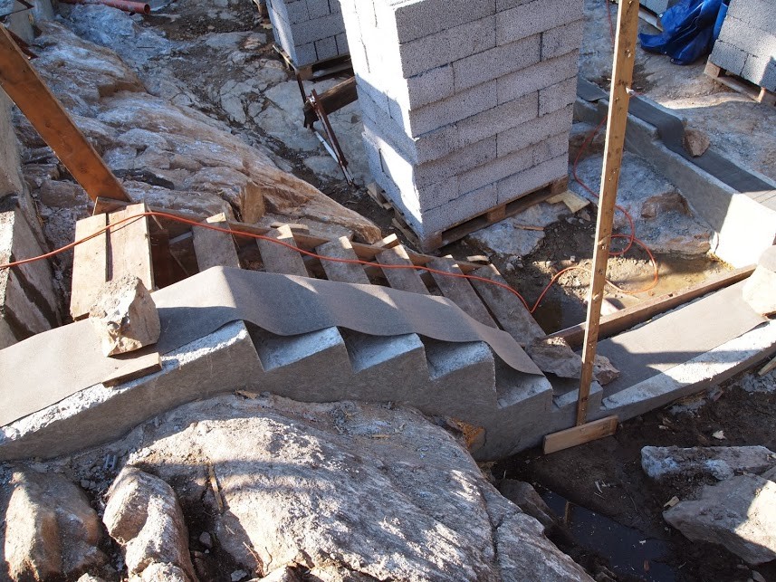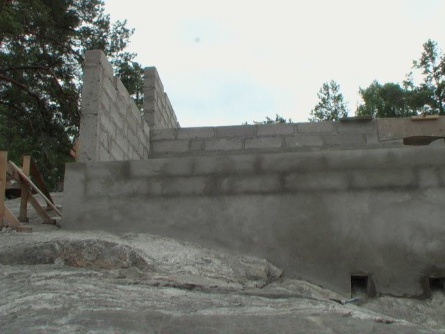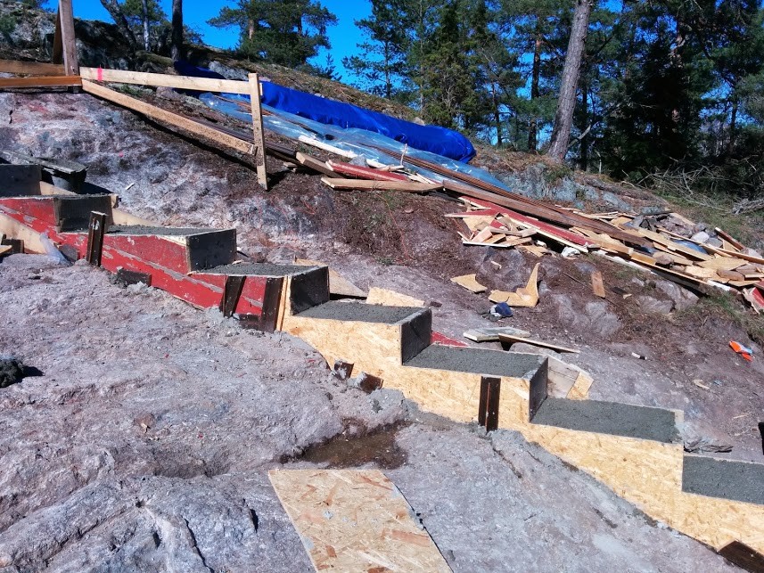 Jag kommer behöva bygga formar och gjuta på liknande sätt direkt på berg. Eftersom det lutar ganska bra på ena långsidan tänker jag för ekonomins skull bygga trappsteg. höjdskillnaden är 2 m över 13 meter. Det kommer bli ett antal trappsteg. Lecasten ska muras på det.