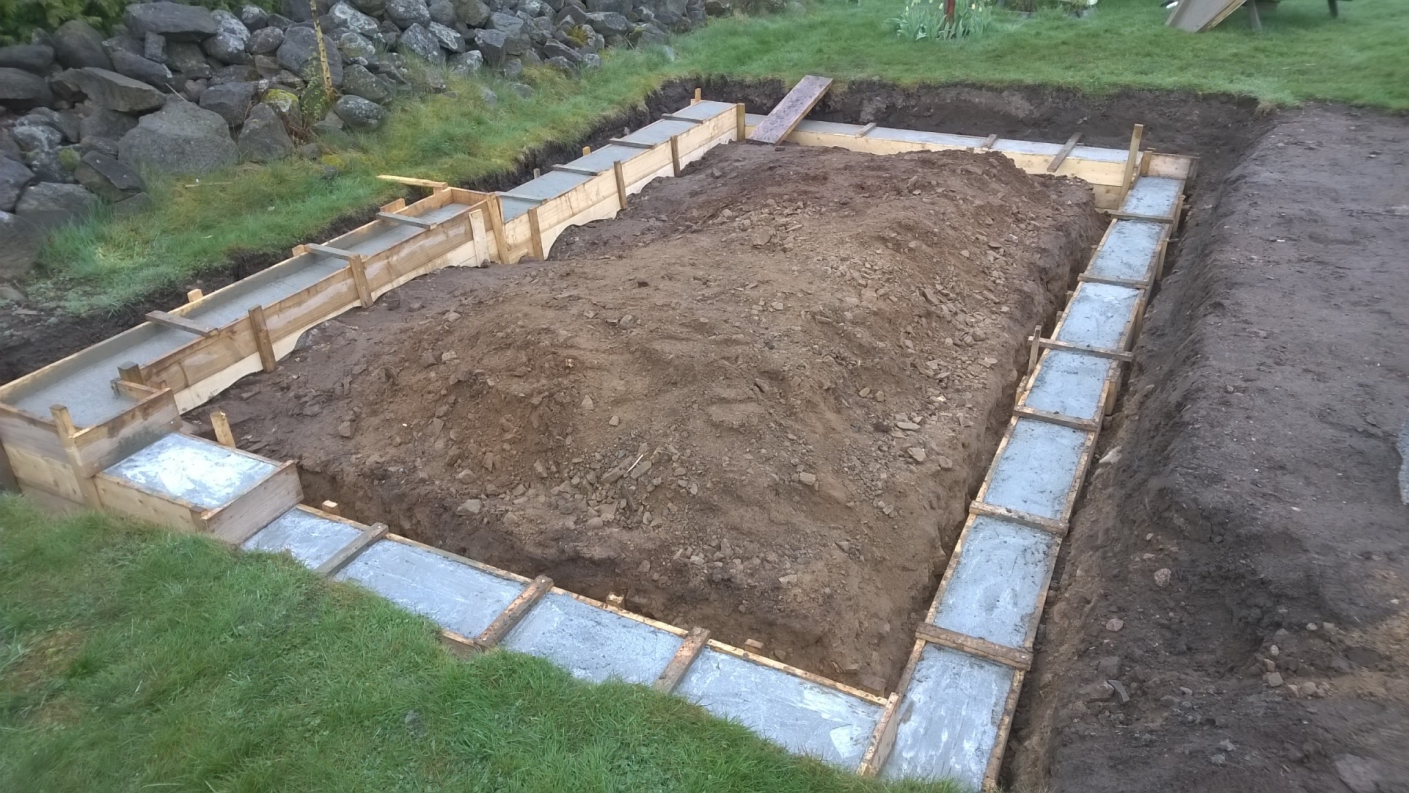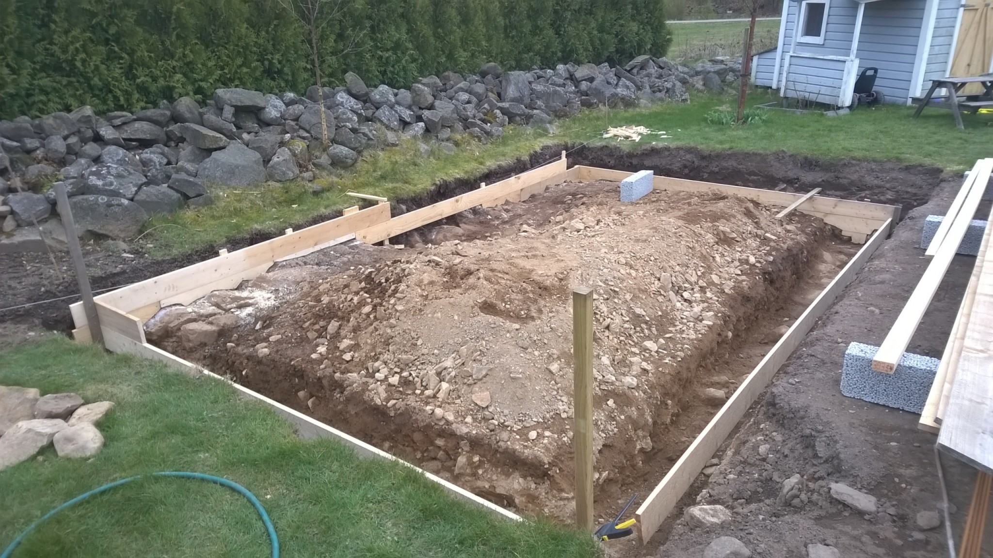 Håller på att gräva nu, gropen är ca 40 cm djup från gräsmattan och ner. Har grävt en ränna där muren kommer att vara ca 35-40 cm bred, som djupast ca 1 meter. Hittills har vi stött på berg längs hela bakkanten, på stora delar av sidan som vetter mot lekstugan samt en del i framkant. På vänstersidan är det inte grävt så djupt än så det finns risk att berget dyker upp där också. Ska man gjuta direkt mot berget eller vad säger expertisen?