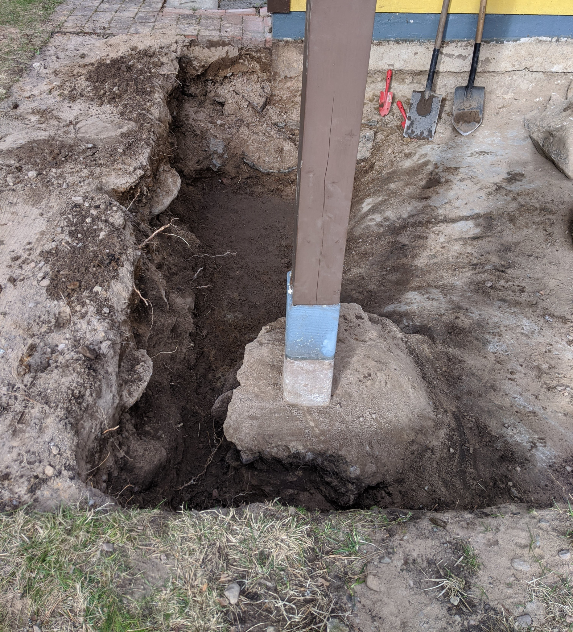 Den delen som skall bli hall har redan ett överhängande tak med en stötta ute i hörnet, de befintliga ytterväggarna står nästan helt på berg, förutom en liten del mot ytterkanten där berget försvinner ner i en skreva och man antagligen fyllt ut den med sten. Vi hade hoppats på att det skulle vara berg hela vägen när vi grävde ut, men så var det så klart inte