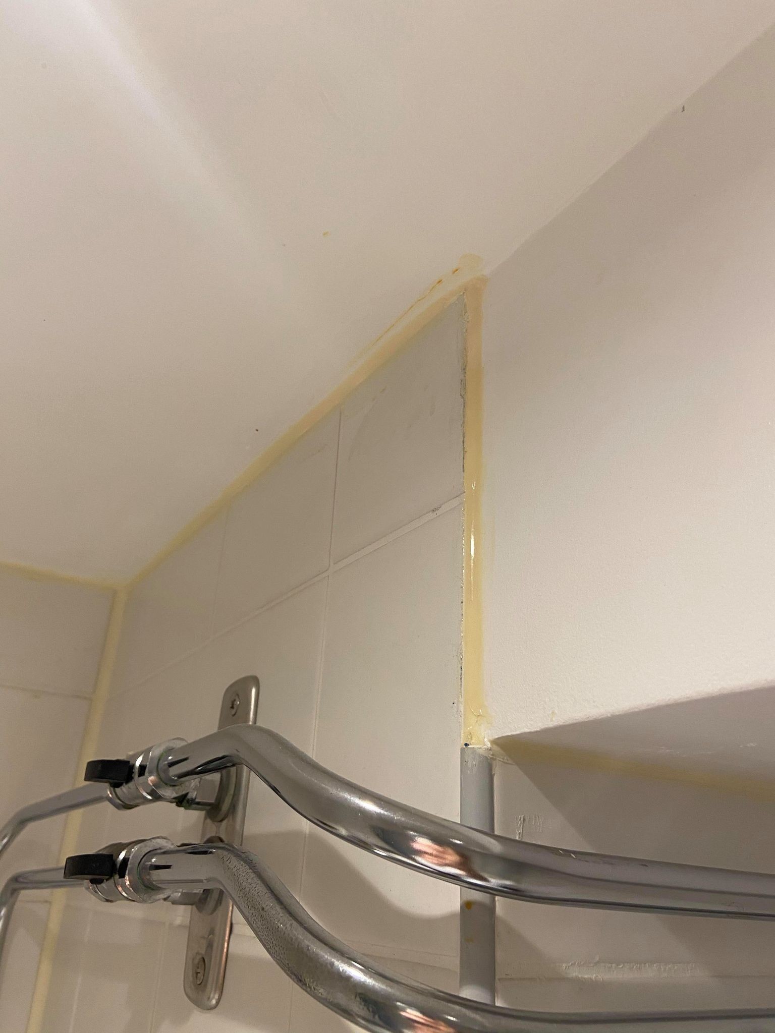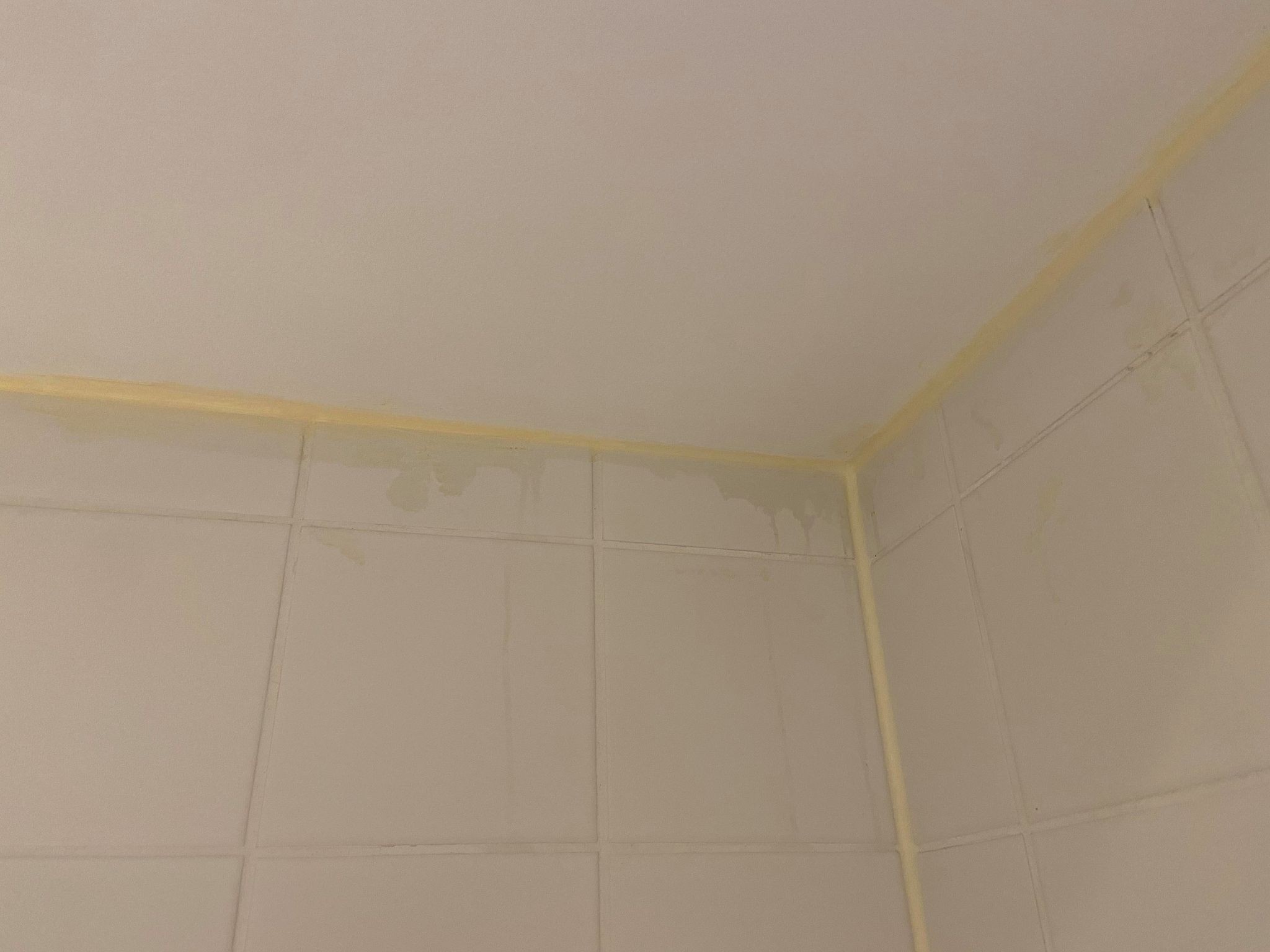 Har sedan en månad tillbaka flyttat till en ny bostadsrätt där förra ägaren har renoverad badrummet genom att dels sätta in duschväggar men även spottar i taket. Något jag inte inspekterade särskilt noga var själva fogarna efter renoveringen. Fick heller inget bra svar från förra ägaren då han gissningsvis anlitat hantverkare. Längs hela taket och sidan av duschväggarna går en ganska utsmetad fog med gul nyans. Det har även runnit något längs kaklet i samband med renoveringen, syns som en mörk skugga utmed den gula fogen i taket.
