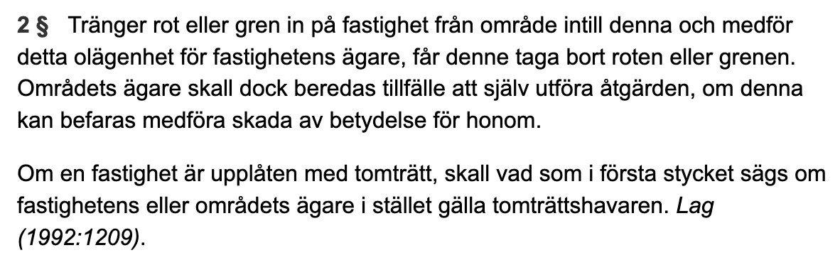 Nästan. Grannen får ta bort gren och rot från de buskar och träd som tränger i på hans fastighet om de orsakar olägenhet för honom efter att han uppmanat TS att ta bort dem och inget händer. Olägenhet är knappast bara att grannen inte gillar dem. Men det kan t ex vara att de står i vägen för något som ska göras på fastigheten, skadar byggnader eller liknande objektiva kriterier.em72 skrev: