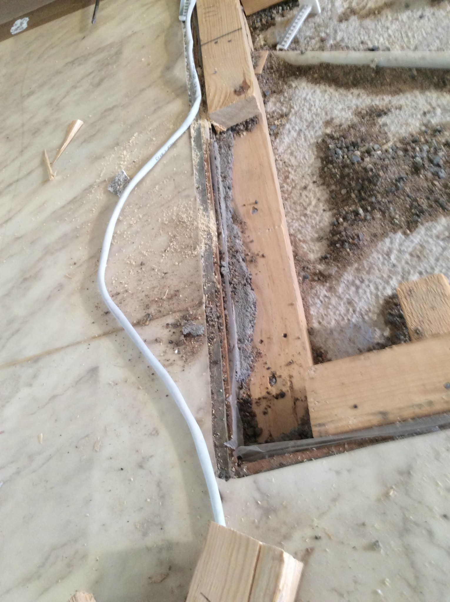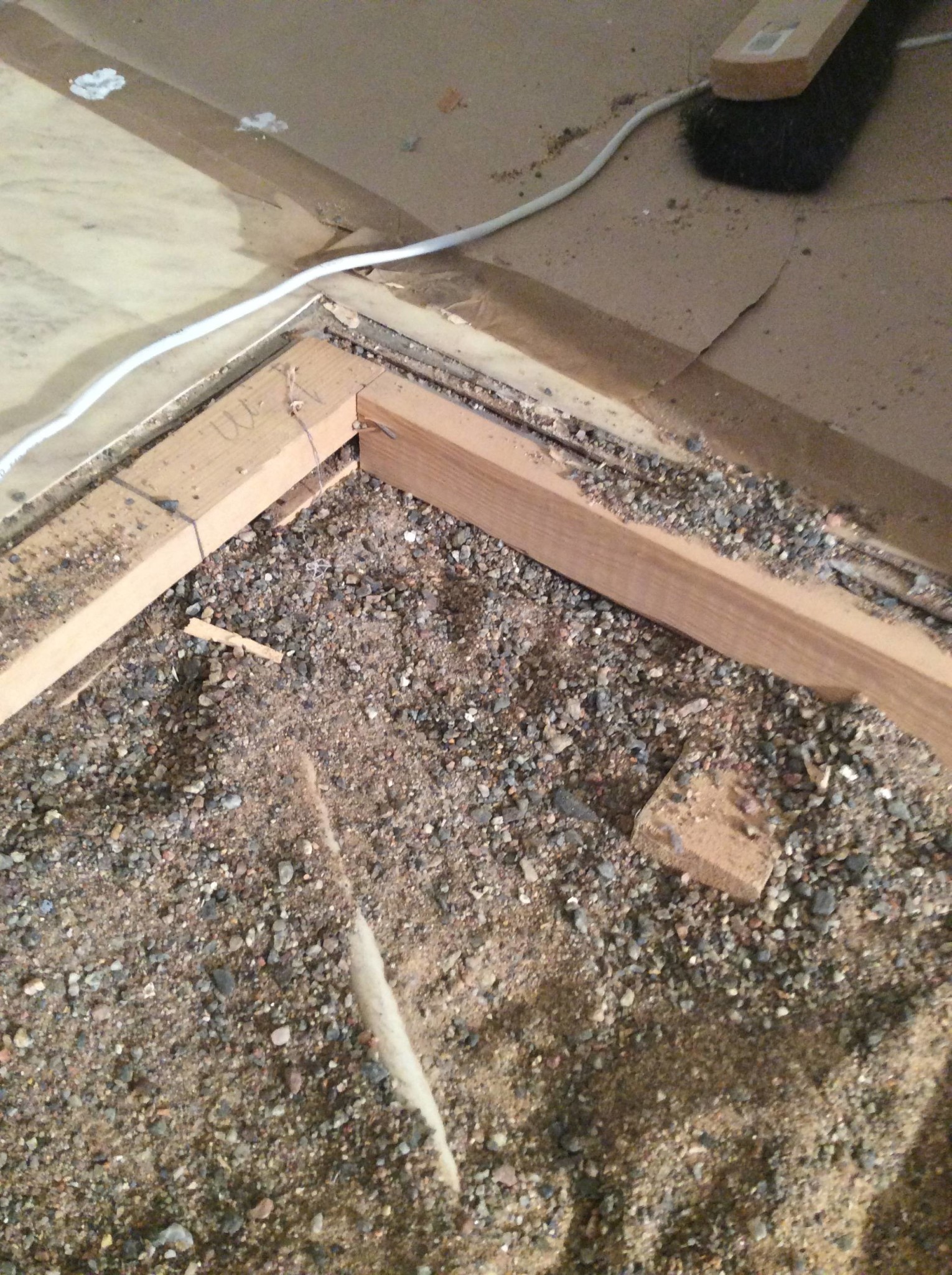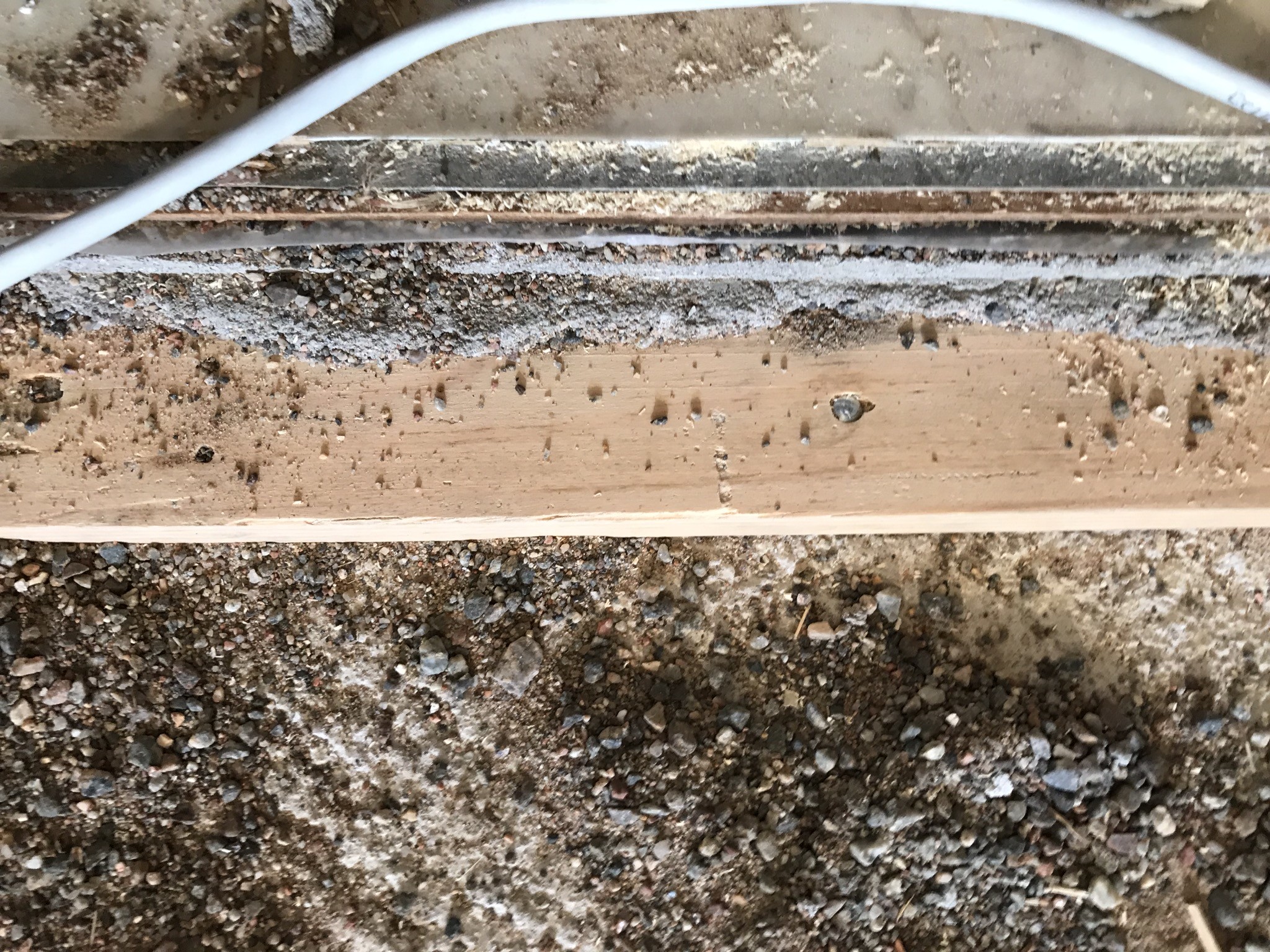 Verkar som tidigare påpekats vara två lager reglar på varandra, med kilar emellan. Är rädd att om jag börjar riva den övre regeln, så rinner sand ut från övriga golvet och jag riskerar att bli tvungen att riva ut ännu mera golv...