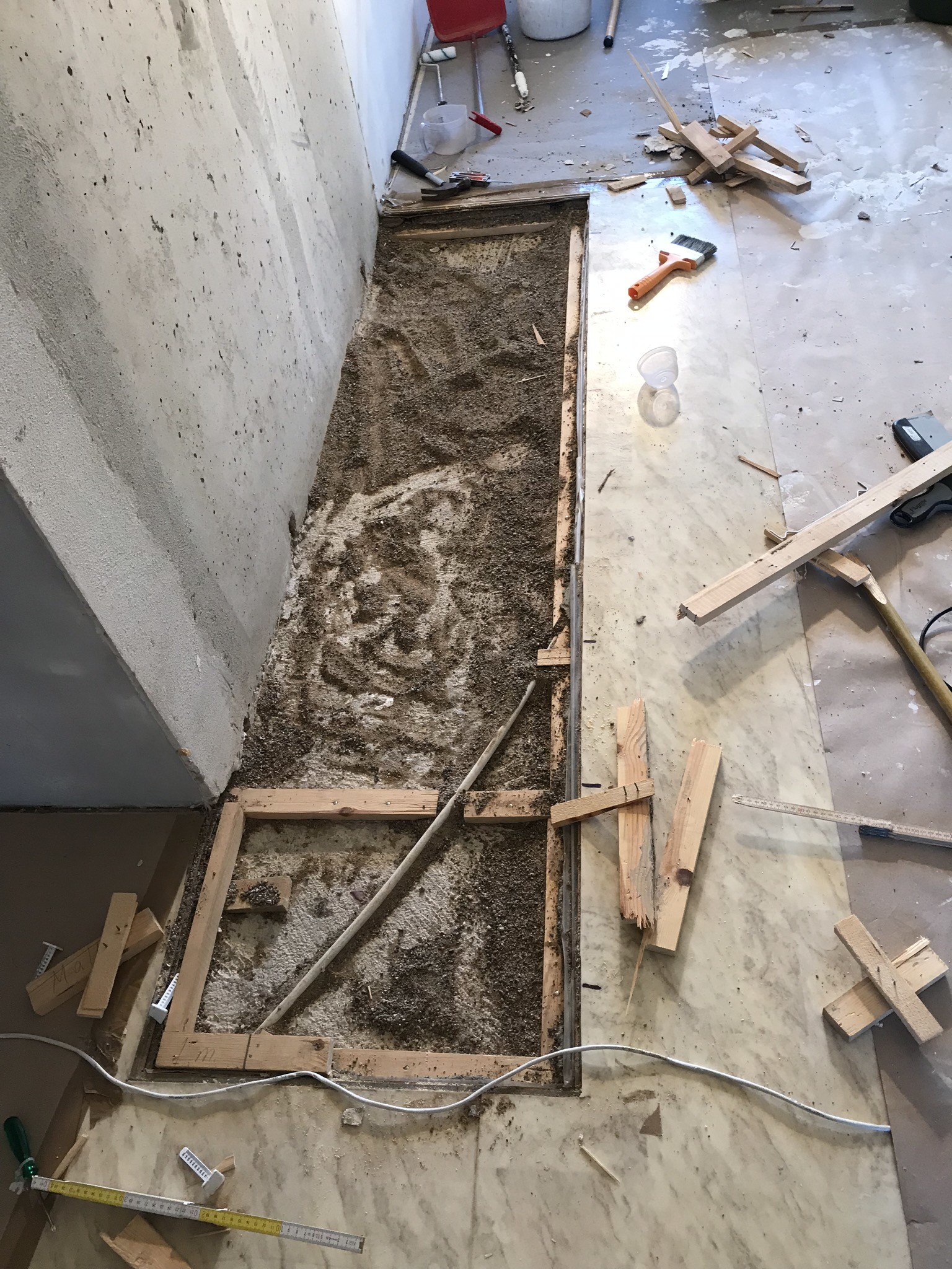 Jag har mätt till 5 cm sand, sedan en plastfolie och därefter väldigt tunt golvspån (ca 5 mm). Hålet i golvet är inte jättestort, så jag undrar om 22 mm golvspån verkligen är nödvändigt? Lite orolig då de reglar som sitter inte är stora, och att slipa ner dem 22 mm kommer göra dem väldigt tunna.