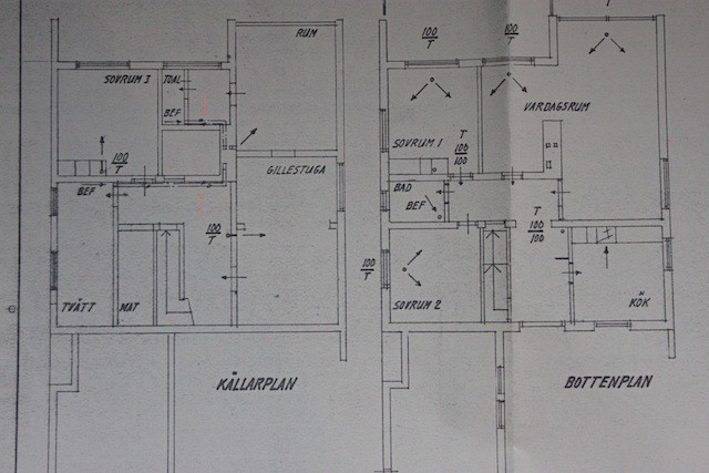 Har planer på att gå igenom vårt gamla pannrum i källaren på två ställen. Tanken är att ta upp två öppningar vid de röda pilarna på ritningen. Syns lite dåligt på bilden, källarplan centrerat. Till höger om det planerade hålet går rökkanaler till spis både i källaren och på våningen ovanför (bottenplan).