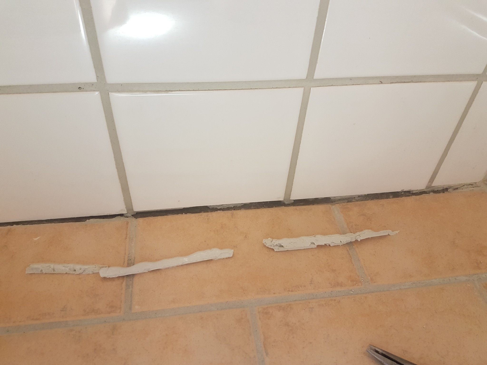 Vi trodde det bara skulle vara en liten bit silikon i hörnen men det gick ned ca 1 cm i utrymmet mellan golvplattorna och väggplattorna (bild 1). När vi nu börjat få upp silikonet har vi blivit osäkra på vad vi har under det. På ett par ställen är det ett tunt lager av ett mörkt material och under det skymtar ett ljust. På den andra bilden har jag försökt fota hur det ser ut.
