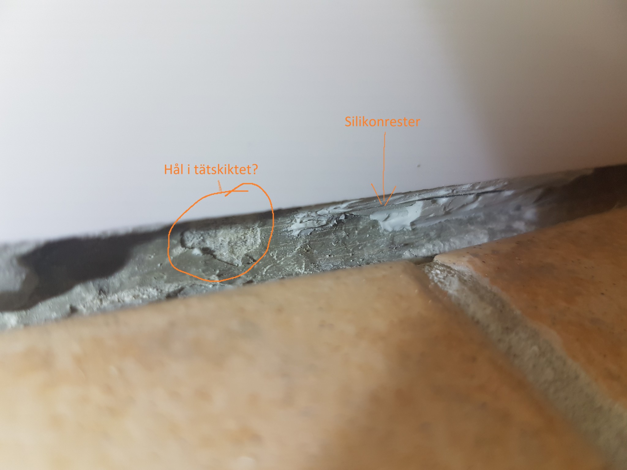 Vi är så klart väldigt oroliga för att det är ett hål i tätskiktet, och att det ljusa vi ser under det mörka är gips eller kakel. Vi är överraskade över att silikonfogen i så fall har legat direkt mot tätskiktet, då vi trodde att det skulle vara fix eller liknande mellan dem.