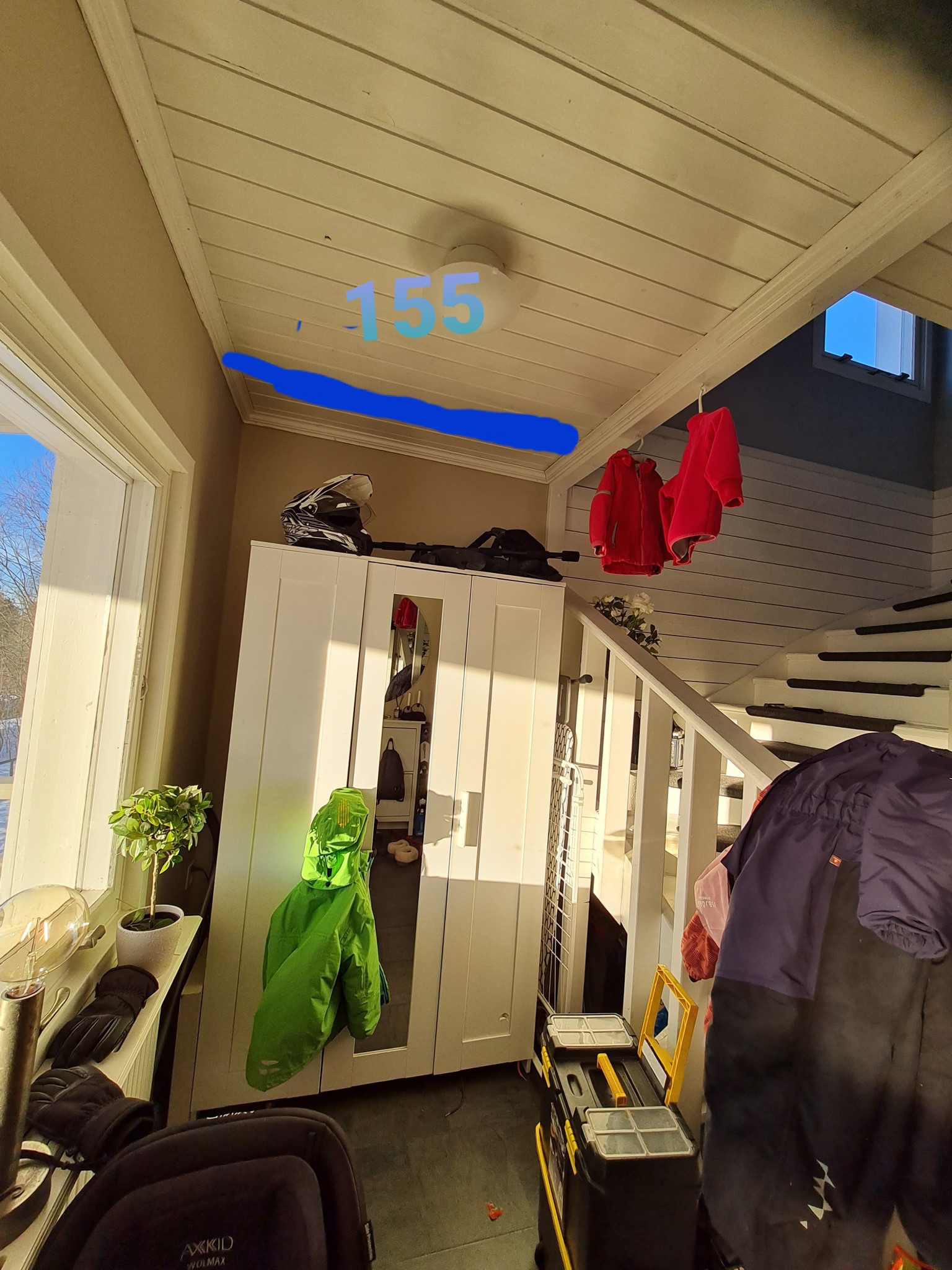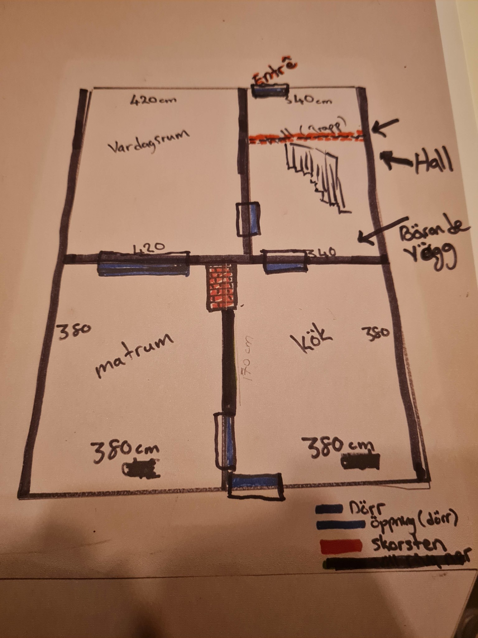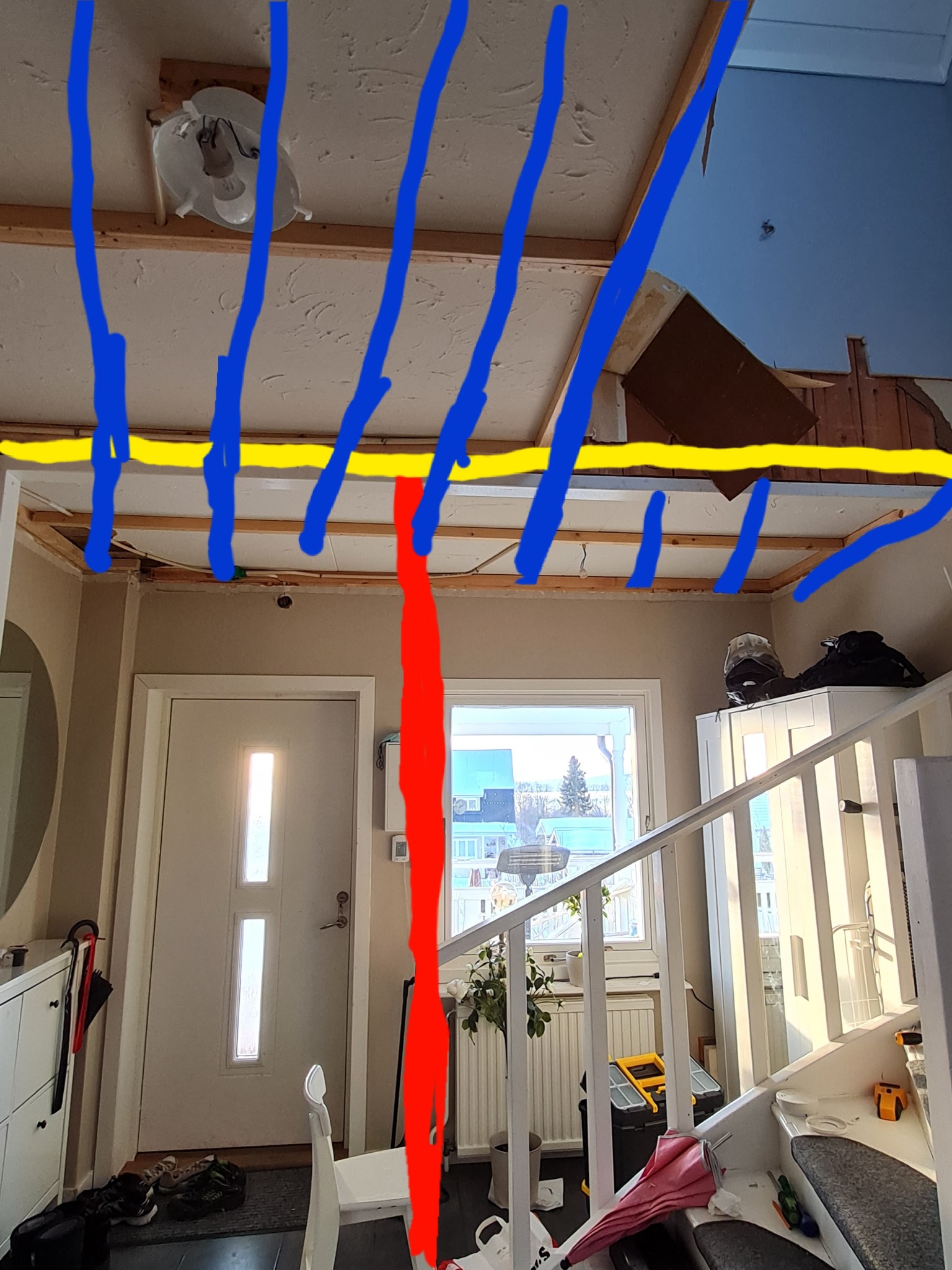 Jag skulle börja med hall och trapp renovering ( gipsa väggar och taket, el golvvärme, klinkergolv, parket golv på trappan bara plansteg, ny räcke till trappan , en totalt renovering blir det ) men har en grej som stör mig, vet inte vad jag kan göra med det och vill inte ha den , det är en stolpe mitt i hallen vid trappan. Som ni kan se på bilden från vägg till vägg 3 m och där med gult märket är 60 cm som jag har tänkt mig att bygga en vägg med bara 45 reglar för att sätta en skjutdörr garderob som kommer bli 150 bredd, så om jag reglar 60 cm med bara reglar (stöt för taket) då är det ca 2.5 m kvar men vad gör den stolpen egentligen? Håller upp hela taket? Den är 95×95