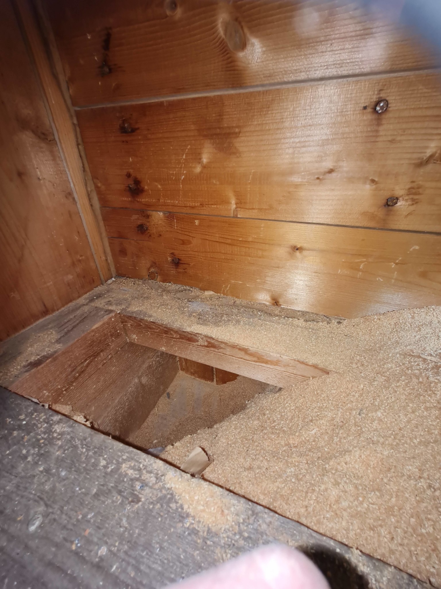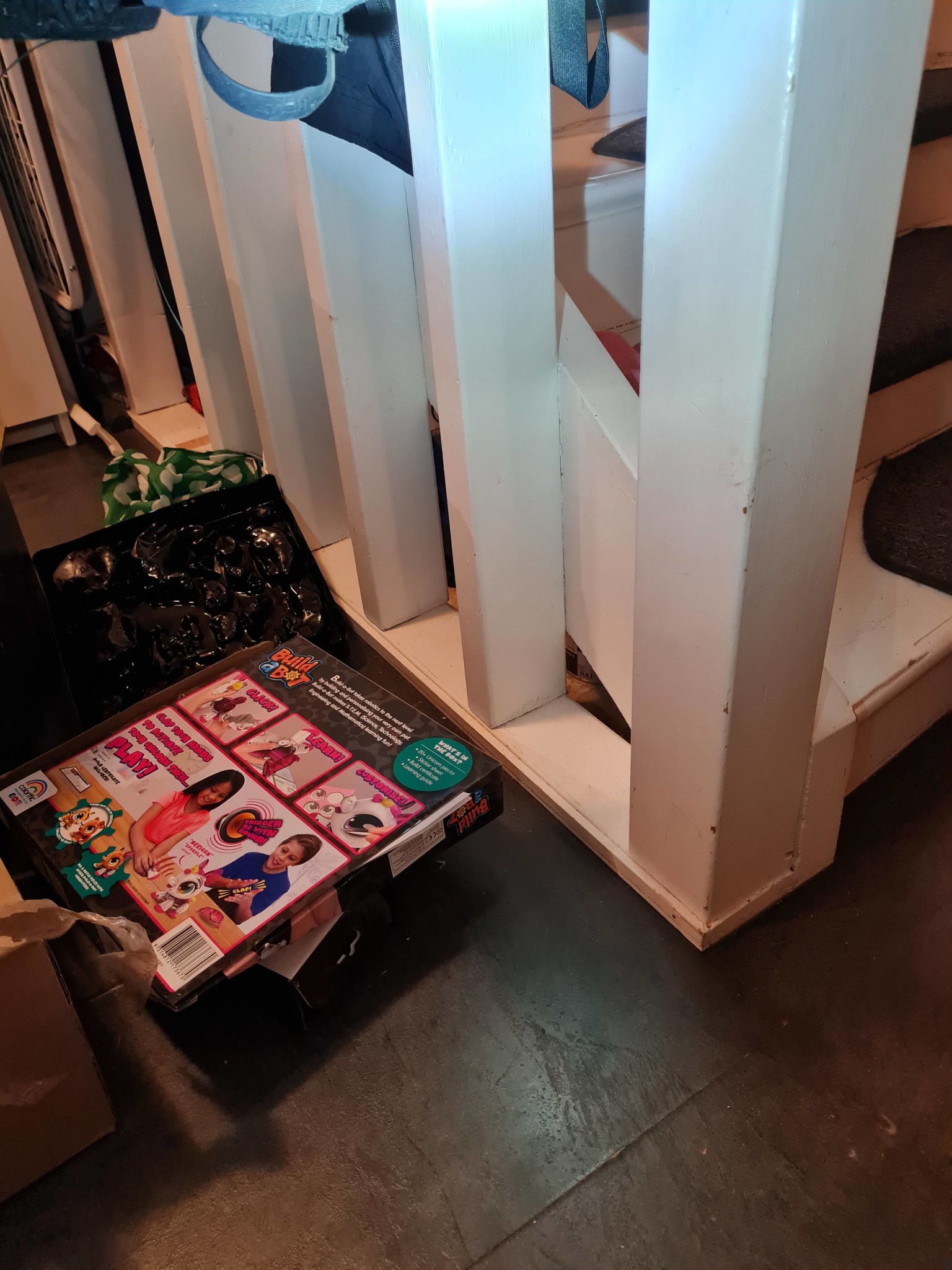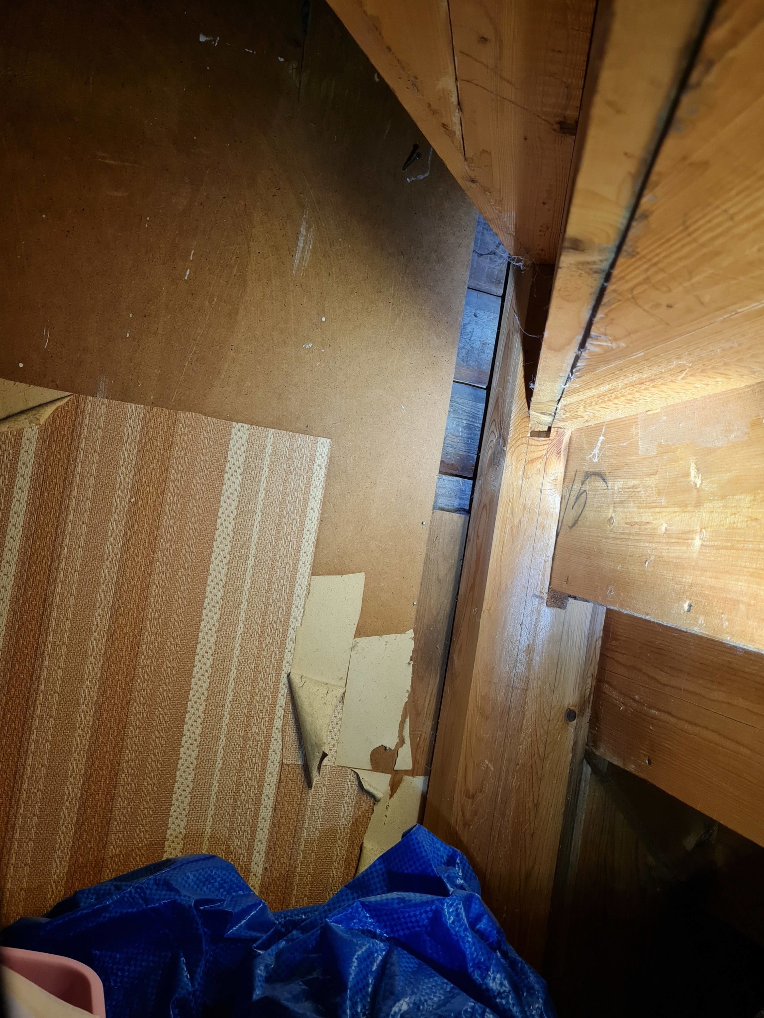 Bilden som visar under trappan, kan ni se lite mörka virke bakom masoniten , dom har varit i visa del av huset och dom tycker jag är från 30 talet,