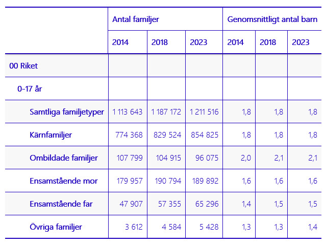 Jag hittar inte just det men Antal familjer och genomsnittligt antal barn per familj för familjer med hemmaboende barn och unga 0-17 år 2014, 2018 och 2023.Alfredo skrev: