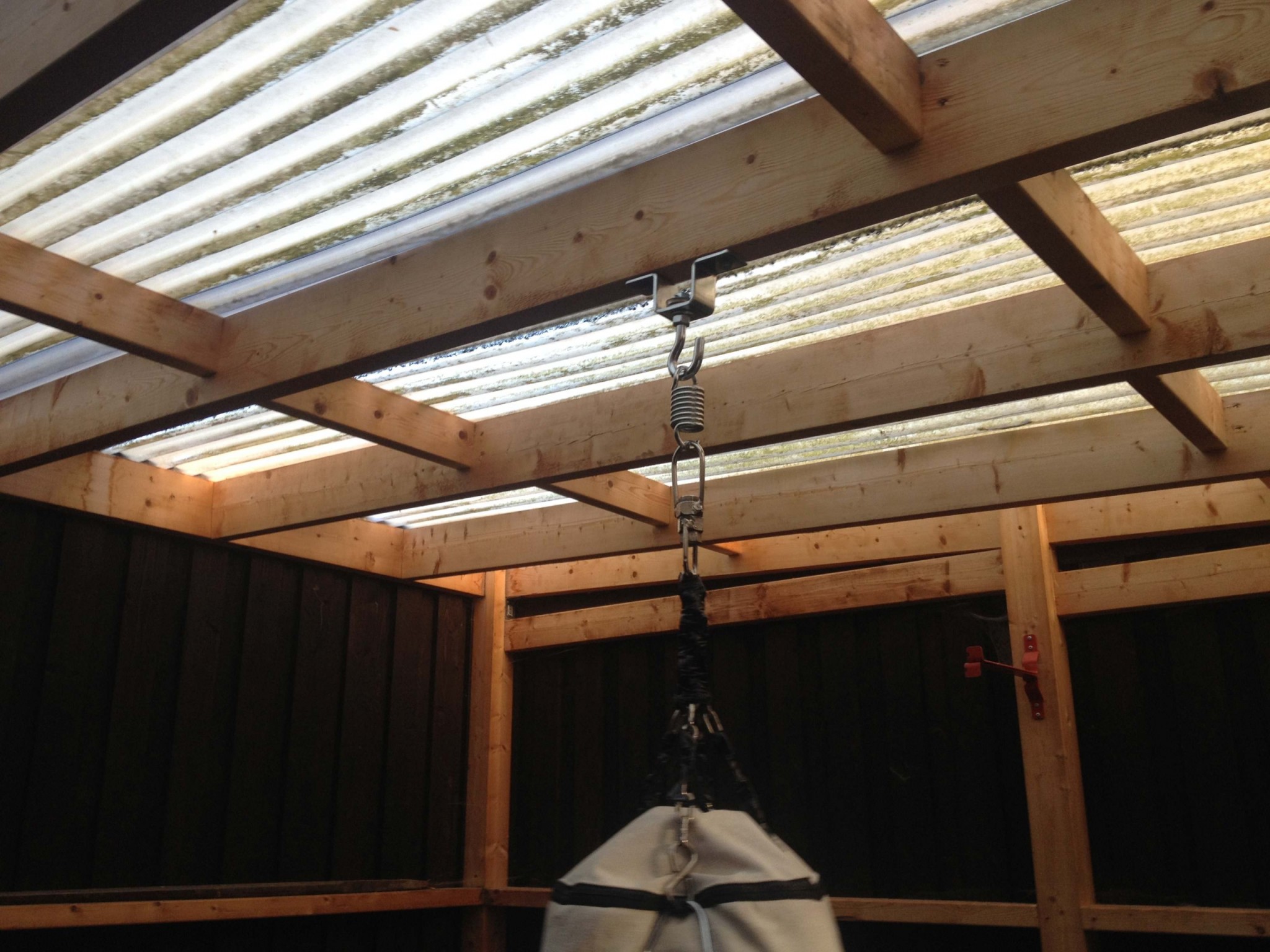 Eftersom jag inte kan någonting om konstruktioner så tänkte jag visa hur cykelförrådets tak ser ut, Möjligtvis kan någon hjälpsam här kan lista ut och tala om för mig om det är säkert att hänga en boxsäck där, eller ge förslag på hur jag kan förstärka taket för att kunna hantera de vibrationer som uppstår från en ca 20 kg tung boxsäck.