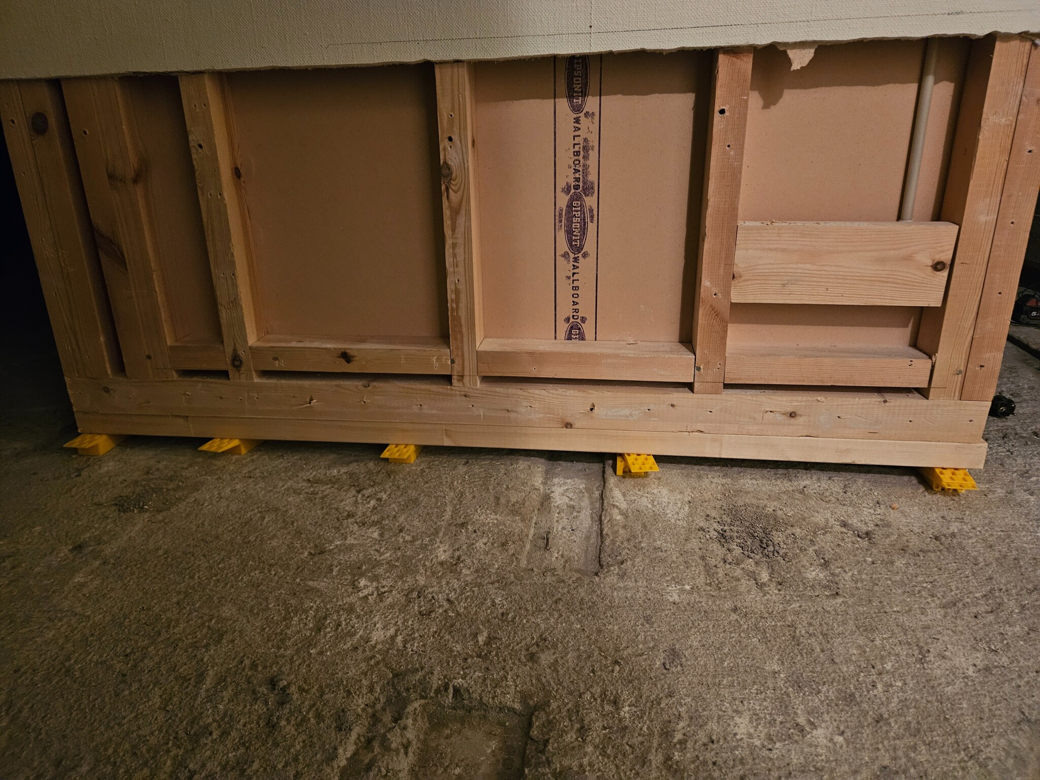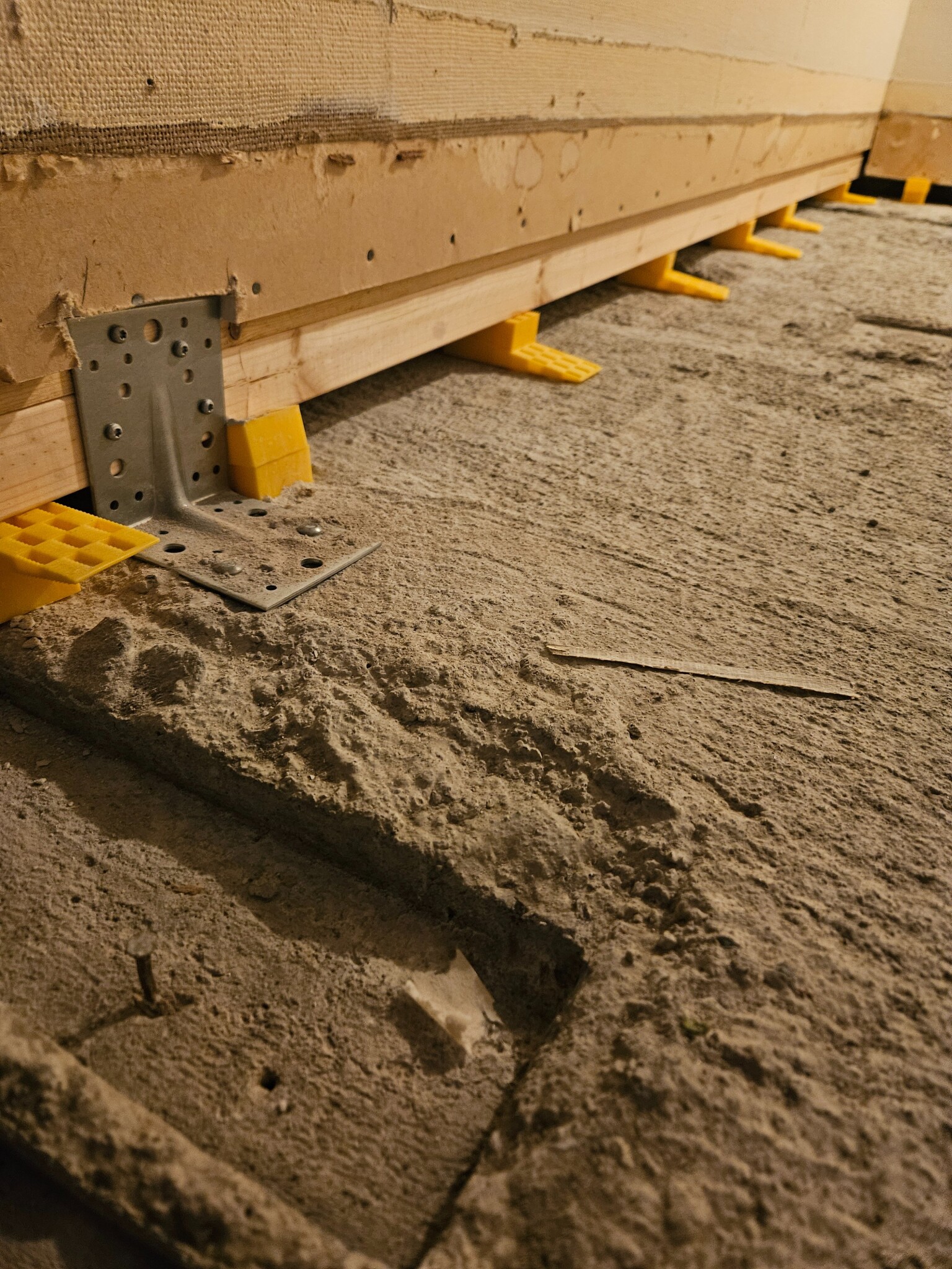 Har en firma som byter syllar i källaren. De har bytt yttervägg med ny papp och ny syll som står på betongplattan. Men väggen i mitten på huset har de bara pallat upp på plastkilar ca cc40cm. Den stod tidigare på en syll . Men då vi lägger ventilerat golv antar jag att det ska lufta under denna konstruktion.