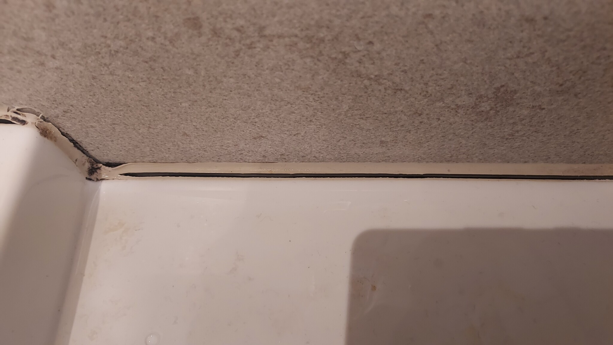 Tvättstället har två hyllor vid väggen där det alltid samlas vatten (extremt opraktisk design), och nu när fogmassan släppt rinner detta vatten ner bakom tvättstället och luckrar upp spånskivan i skåpmöbeln under.