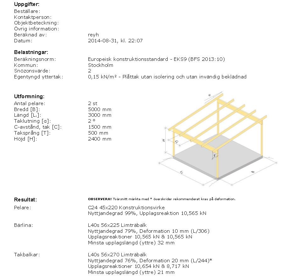 Ditt exempel är 5000mm och cc=600 vilket med 220 reglar ger 10 N/mm2. Mitt tak är 3000mm och cc=950mm vilket skulle varit 170 reglar. Nu har jag säg 55 reglar så är det 95 N/mm2.Barnrikehuset skrev: