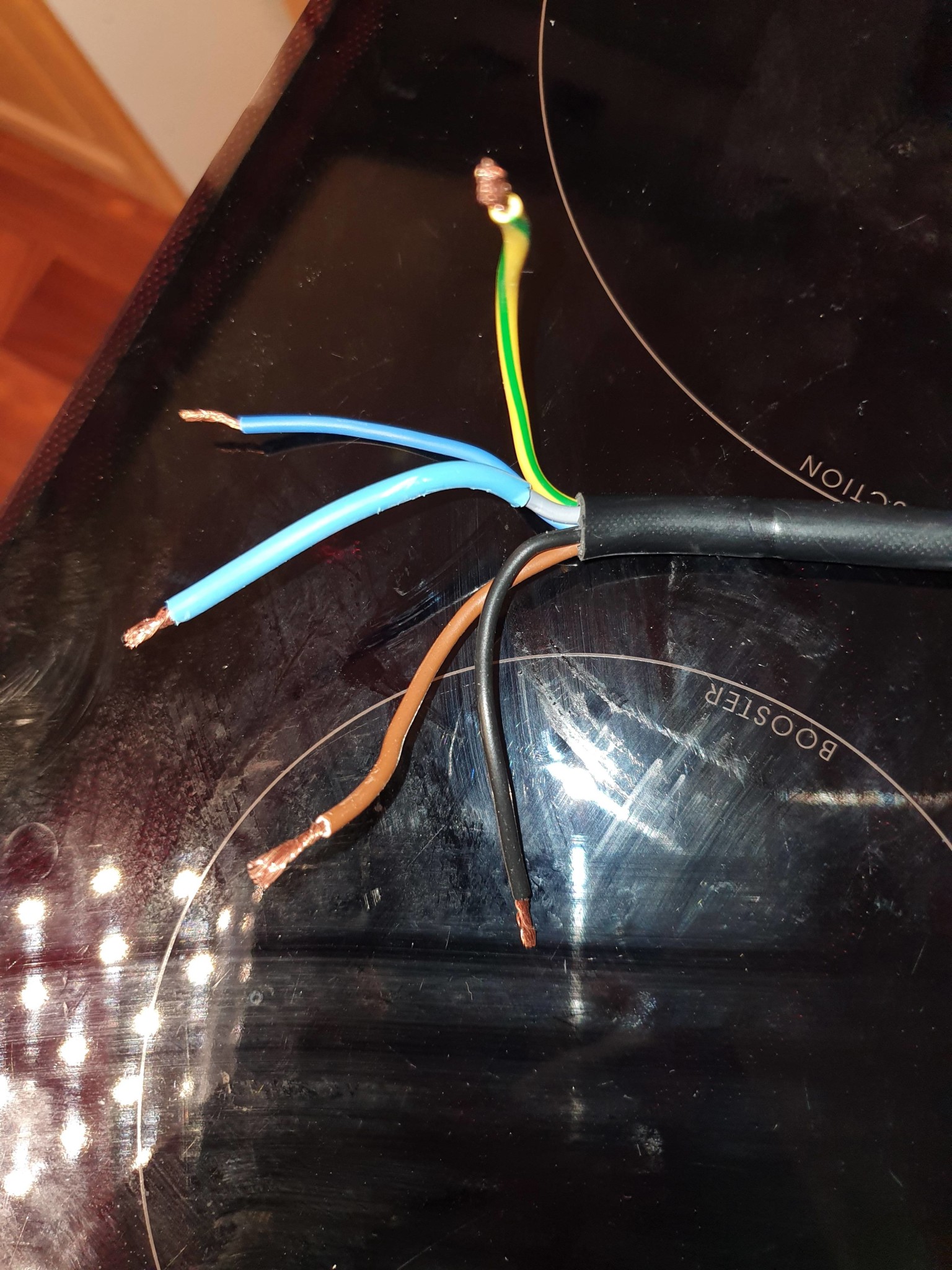 Vi kan nog sluta oss till att hällen vill ha 230 V, via två parallellkopplade ledare per pol vilket stökar till förståelsen rejält. Men när det gäller hällar och spisar behöver man dubbelkolla allt.