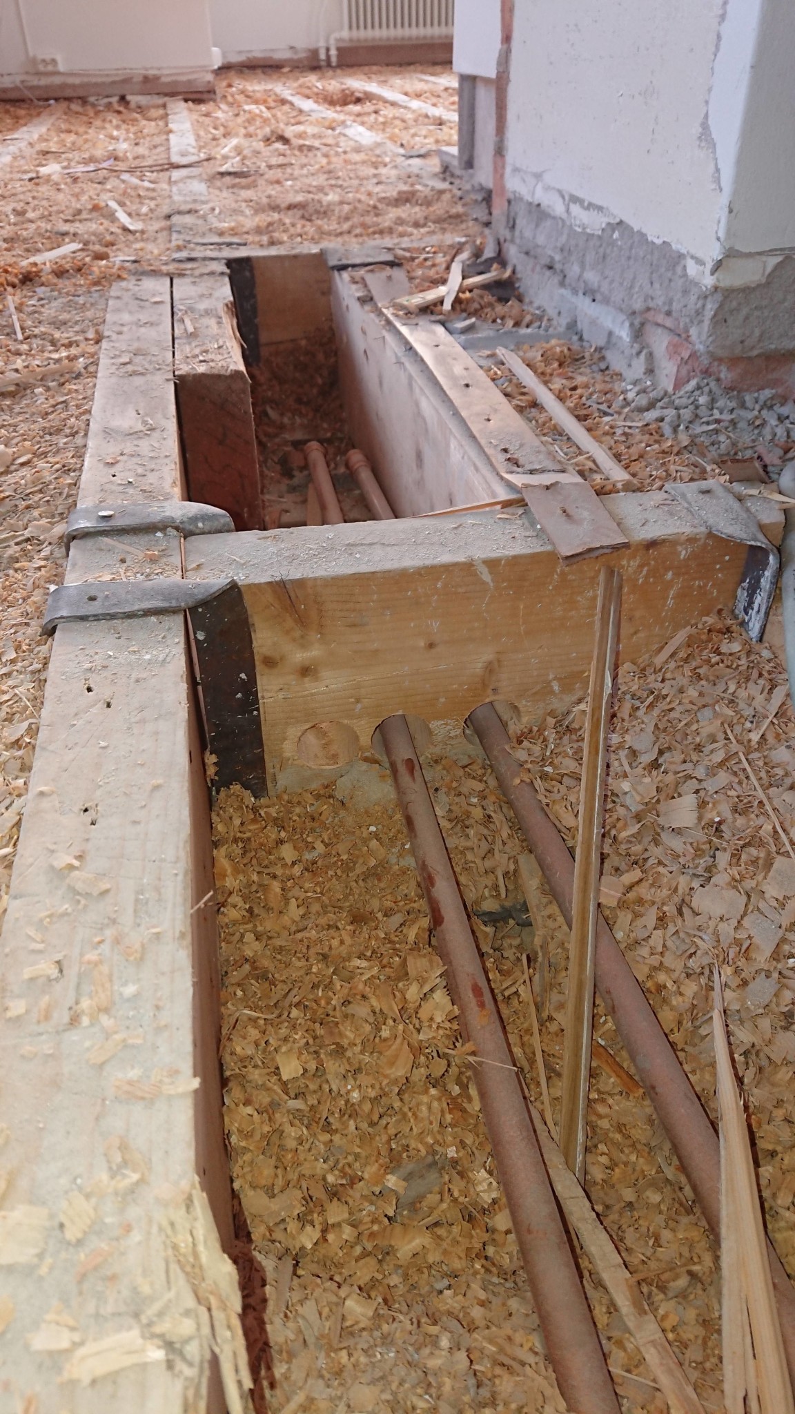 Då ser vi att tidigare ägare har borrat 3 hål i en bärande balk (avlastning runt murstock) för att dra om värmerör(matarledning), se bilder