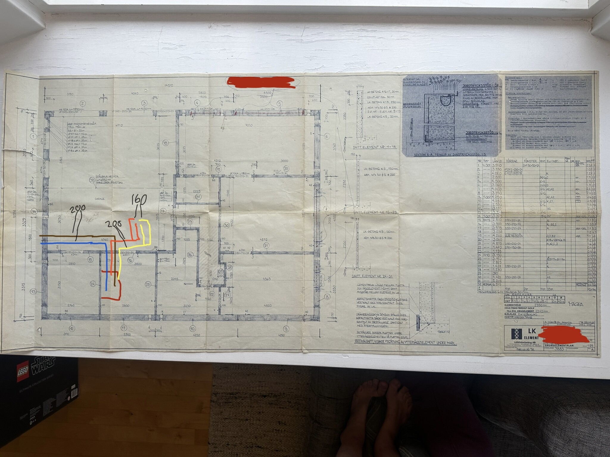 Källarväggar i klinkerbetongelement (enligt ritning) och bjälklag mellan våningarna är kanske samma, båda dessa element är väldigt sega att borra i känns som vanlig betong. Total yta ungefär 280-300kvm.