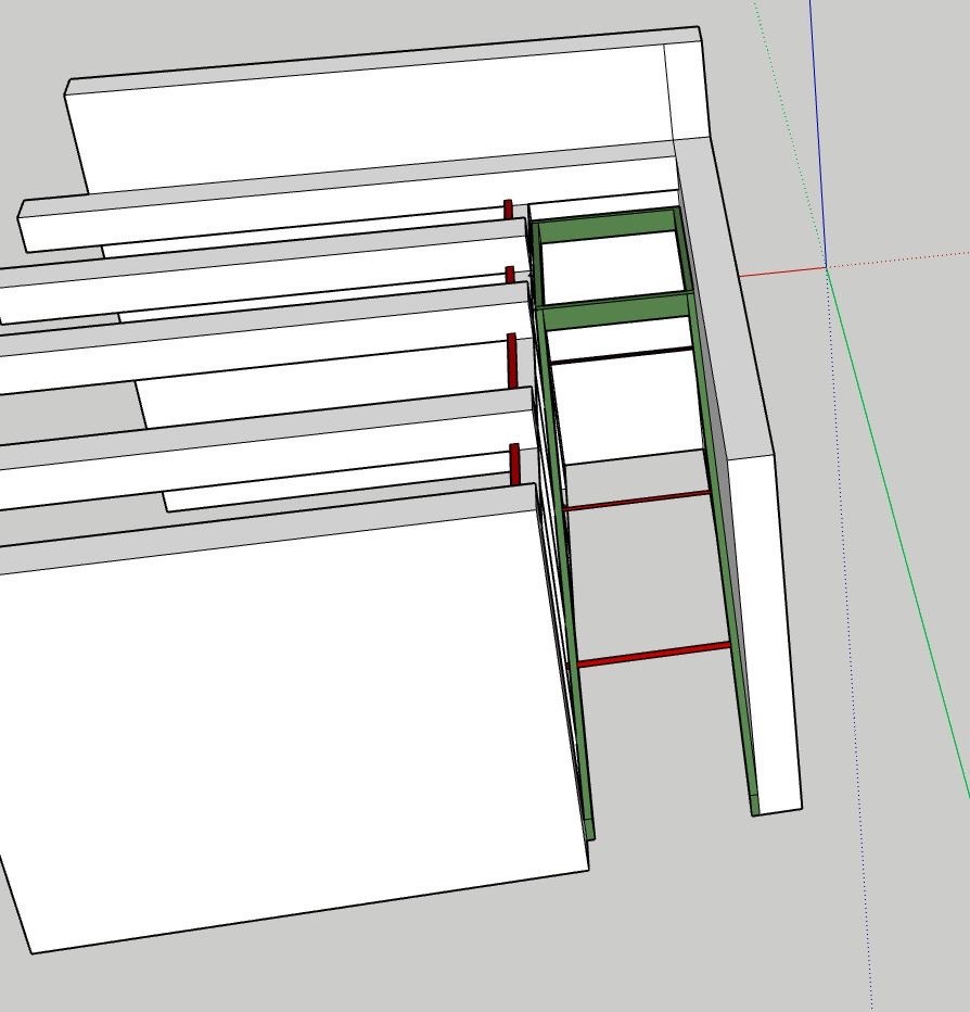 Ovanpå den nya väggen som ska bära lasten av bjälklaget monteras en liggande 45x45 regel (markerad i röd färg på bilden). Motsvarande 45mm brett och 45mm djupt spår kapas ut ur balkarna. Balkarna skruvas sedan i väggens ovansida.