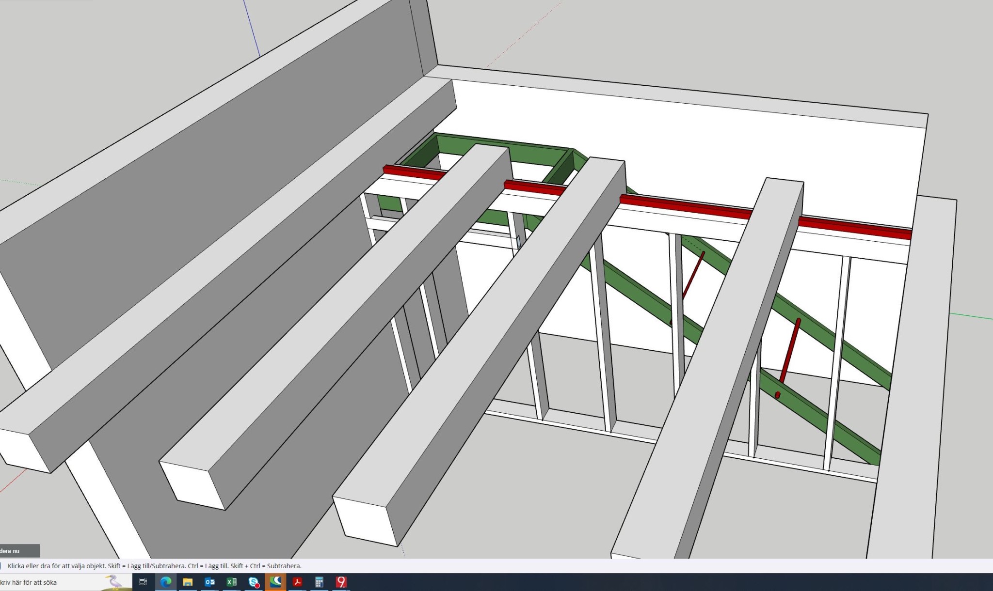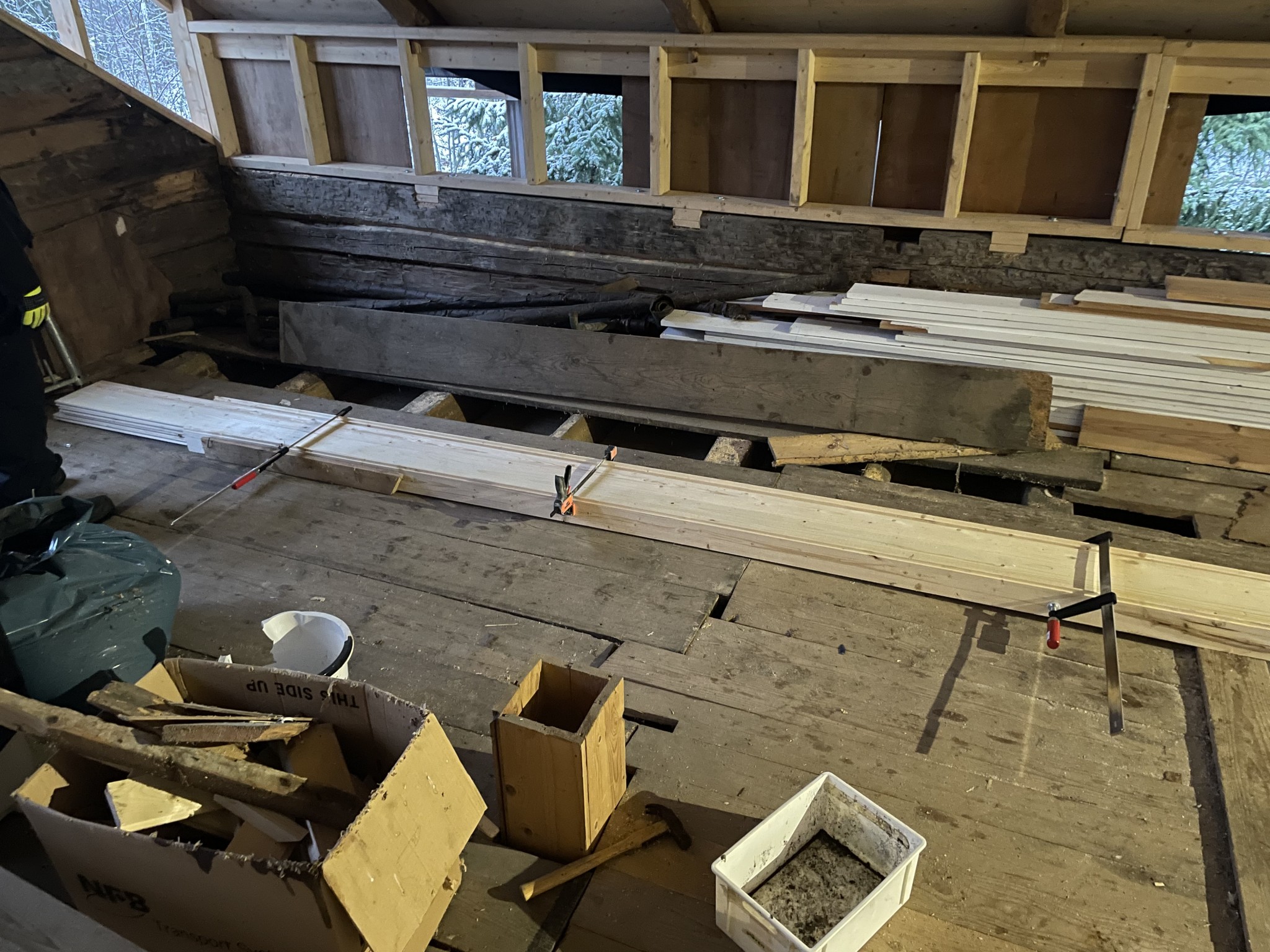 För detta behöver jag kaps av 5st bjälkar i mellanbjälklaget och växla av lasten med en mellanvägg i trappans längd.
