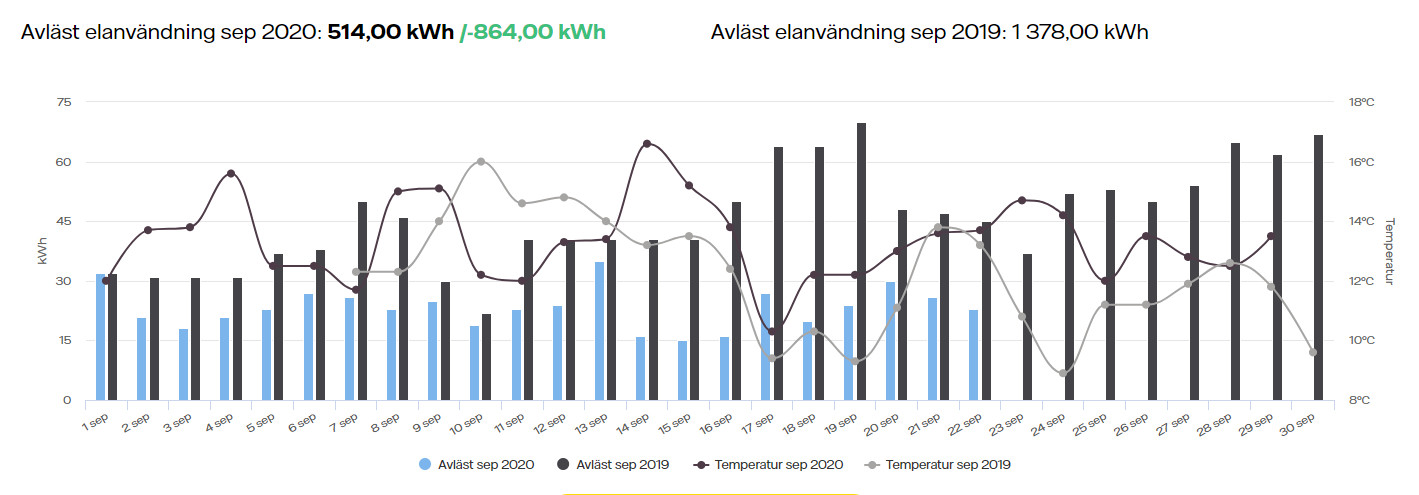 I maj 2020 så installerade jag appen Greenly och fick då koll på timdatan för vår elförbrukning. I september förra året så förbrukade vi 1378 kwh, och i år tom 27/9 har vi förbrukat 635 kwh.