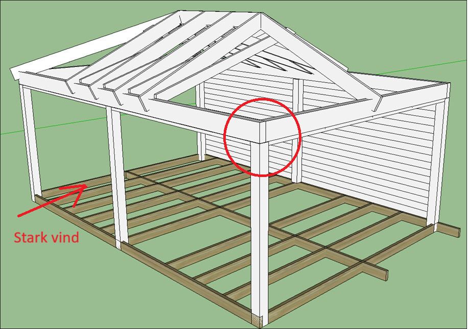 Stolparna fästs i bärlinan. Hammarbandet av limträ är tänkt att läggas uppepå stolparna och fästas med vinkeljärn i stolparna. Finns det en risk att konstruktionen "viker sig" om det blåser storm mot långsidan? Det går inte att få dit några "dålda" snedsträvor på kortsidorna för att stadga upp mellan stolpar och taket (hammarbandet)