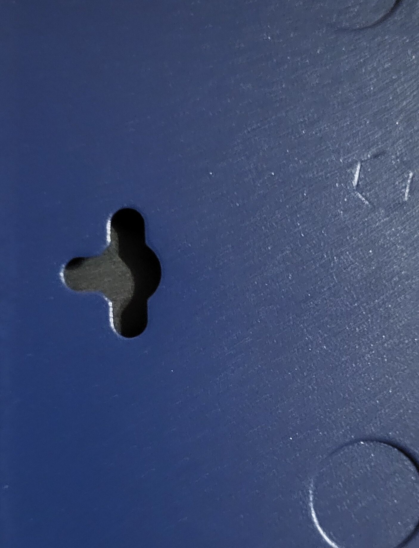 Den har alltså ett sånt där klassiskt upphängning hål med slits, där man för in skruvhuvudet och sedan låter skruven åka upp i sliten när "prylen" som ska hängas sjunker ner av tyngden.