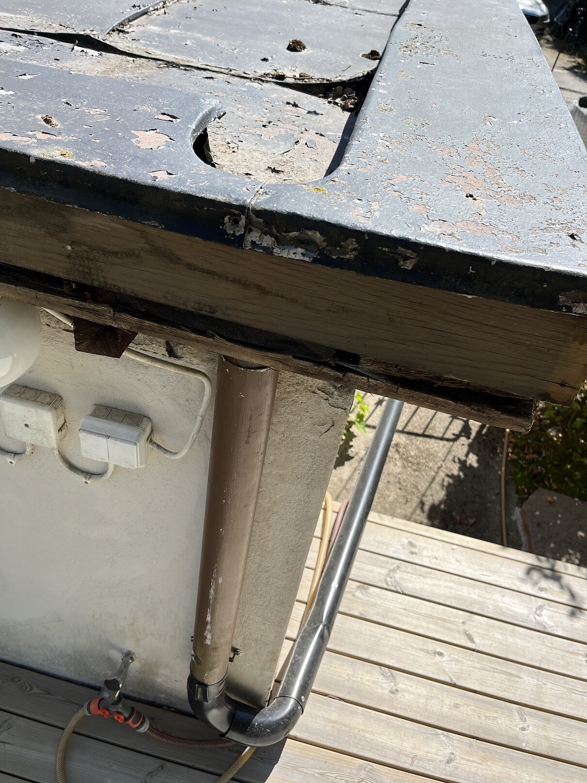 Det du har är den sämsta kombinationen av invändig avvattning och utvändigt stuprör och dessutom en alldeles för liten "brunn", imponerande att det funkat så länge.