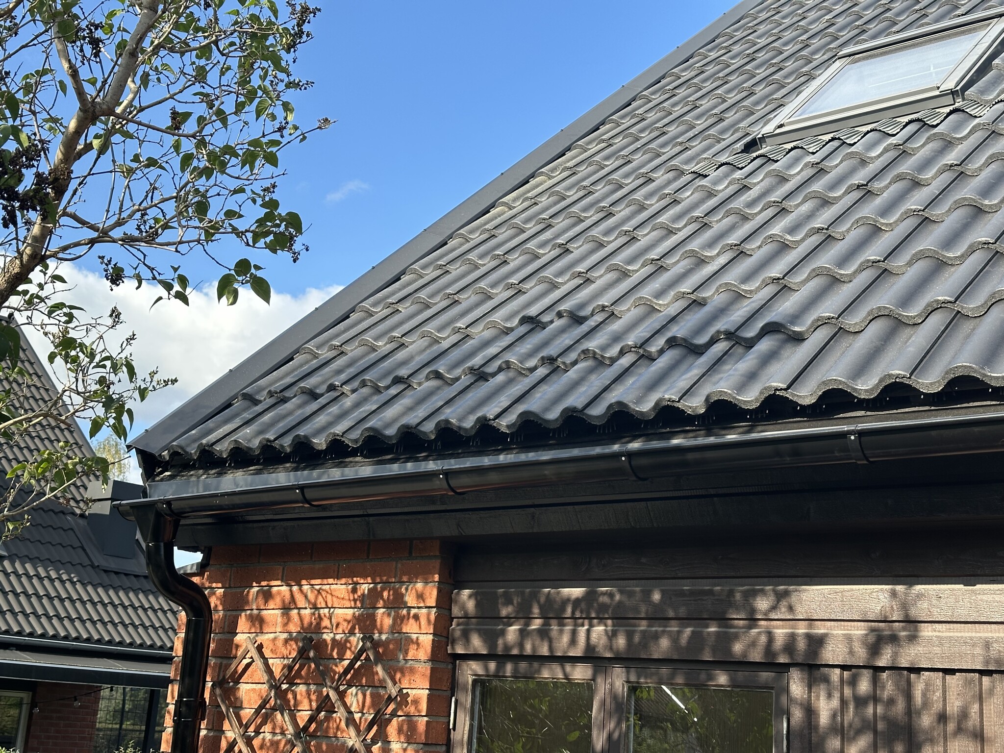 Fast det är plåtens uppgift att fånga vattnet på precis det där viset. När det kommer kraftigare skurar så kommer vattnet ha mer fart och landa mitt i rännan. Om takpannan hade hängt ut längre så skulle kraftigt regn sannolikt spolats ut utanför rännan och det hade inte heller varit så lyckat. Visst man kunde ha låtit pannorna sticka ut 10-20 mm till för att få lite mer av den "vanliga" regnet att hamna mitt i rännan men det är inget fel att låta det träffa plåten som det gör nu.
